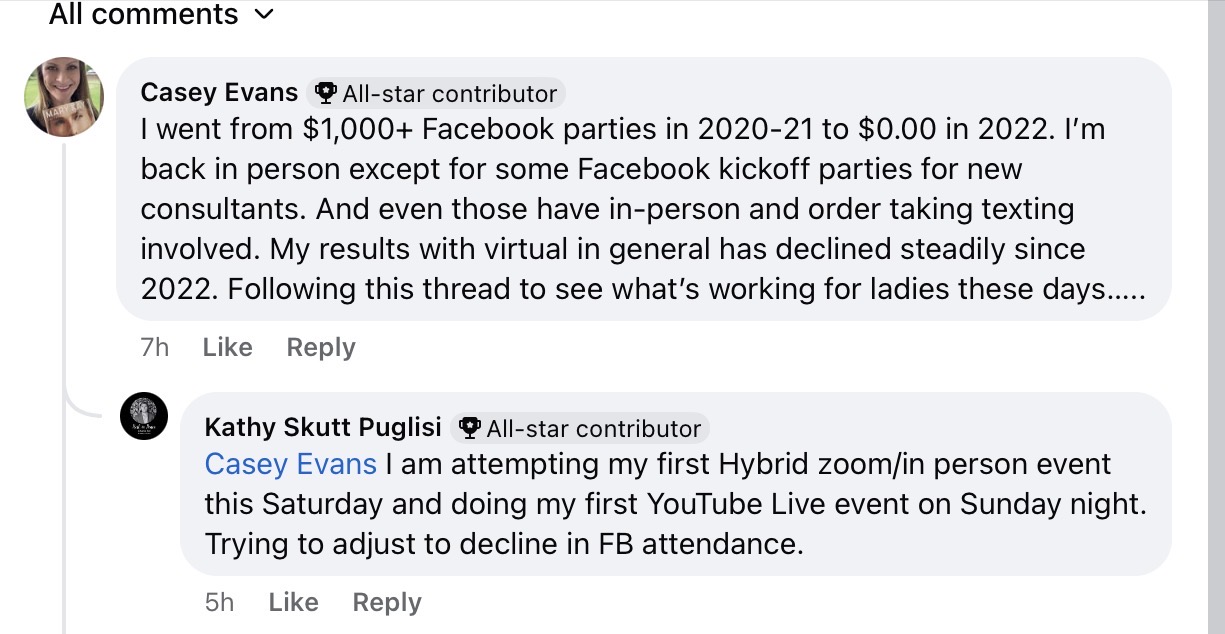 Casey Evans regularly had $1000 plus parties in 2020-2021 but had 0 in 2022. She’s not had much luck with virtual parties since then.