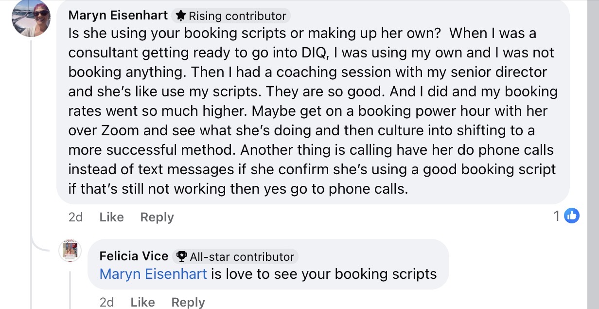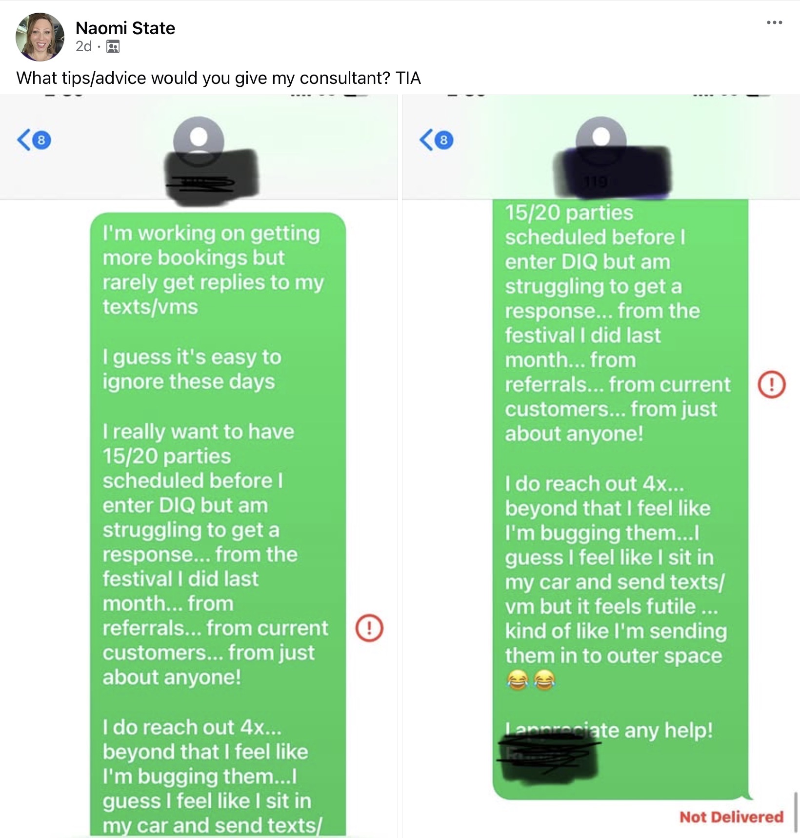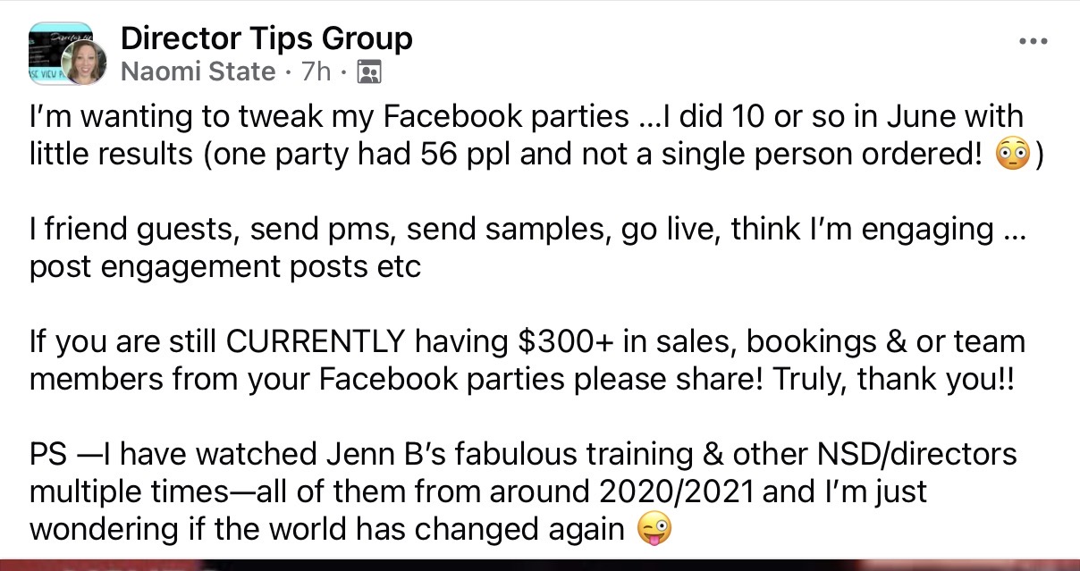 Naomi did ten Facebook parties in June. One had 56 people. She didn’t receive many orders! She asked for help from directors who regularly had Facebook parties with $300 or more in sales.