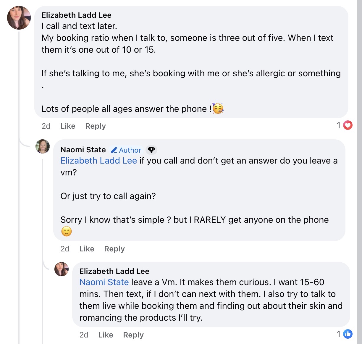 Elizabeth Ladd Lee likes to call. She gets 9 bookings out of 15 attempts if she calls. If she texts its about 1 in 15. A customer will listen to a voicemail and be curious and call back. Naomi admits she rarely gets an answer on the phone.