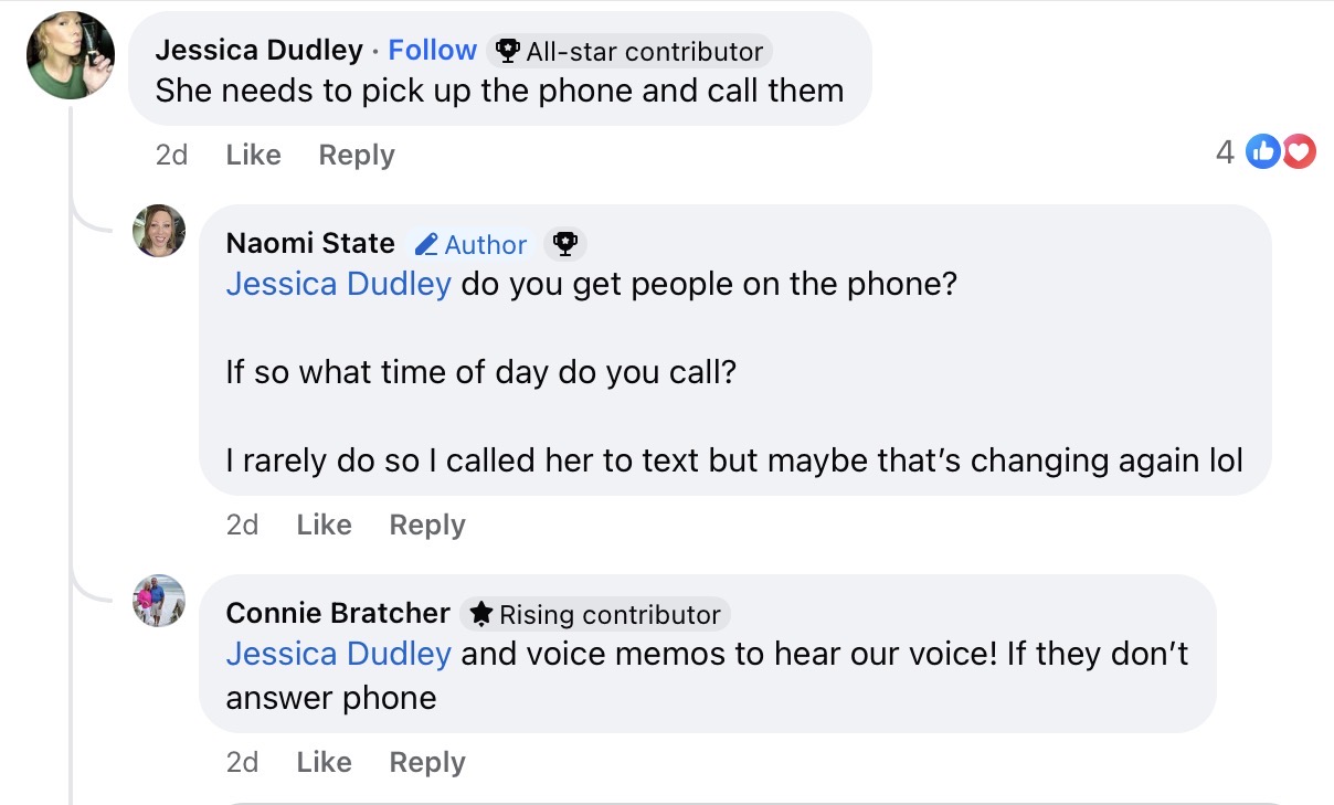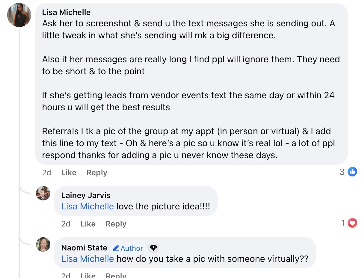 She also posted a question from one of her unit members. How do you get people to reply to your texts? As a director, shouldn’t Naomi have this down to a science?