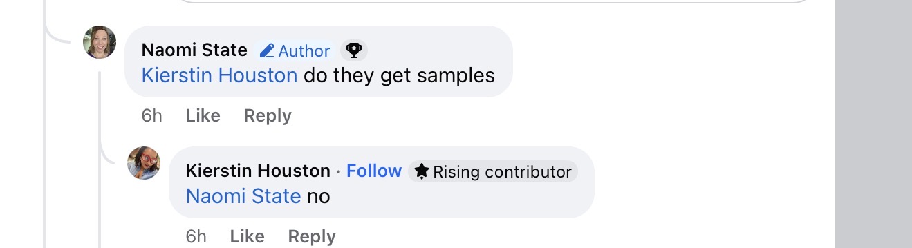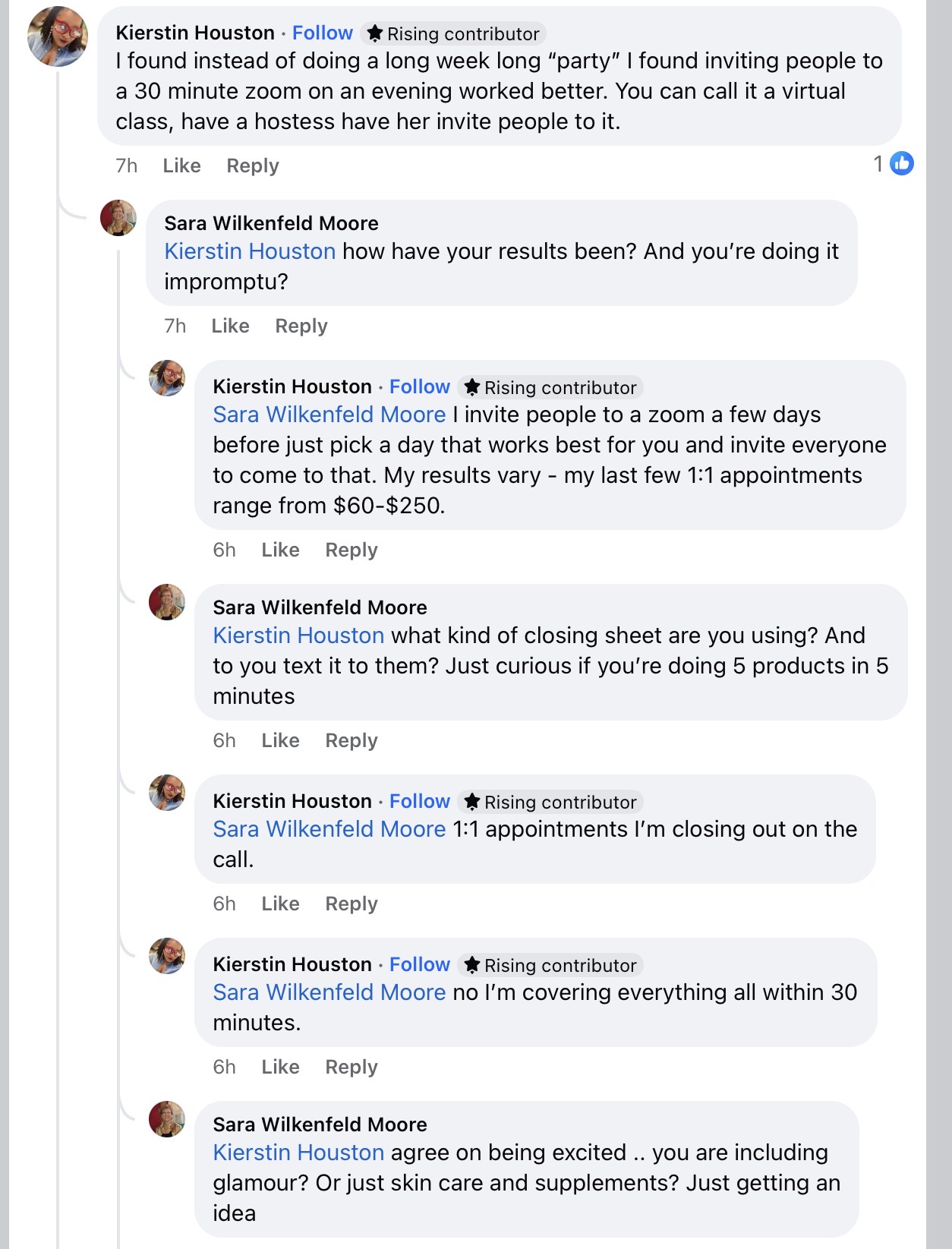 Chelsea Adkins’s downline Kiersten Housten shares that she invites folks to a 30 minute Zoom. She’s been seeing $60-$250 for each Zoom. She does NOT send samples.