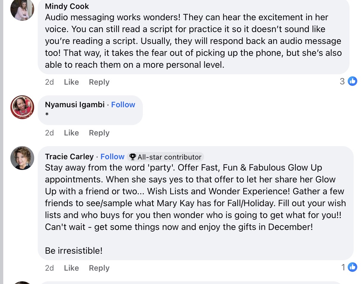 Mindy Cook loves audio messages. She can hear the excitement in your voice and respond with a message herself without having to have a phone conversation. Tracey Carley says to avoid using the work party. Sell it as a Glow Up Appointment. Bring two or three friends with you and you can all create wish lists for people to use to buy your holiday gifts.