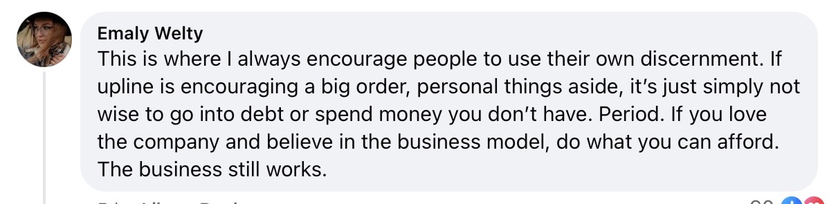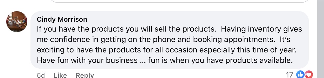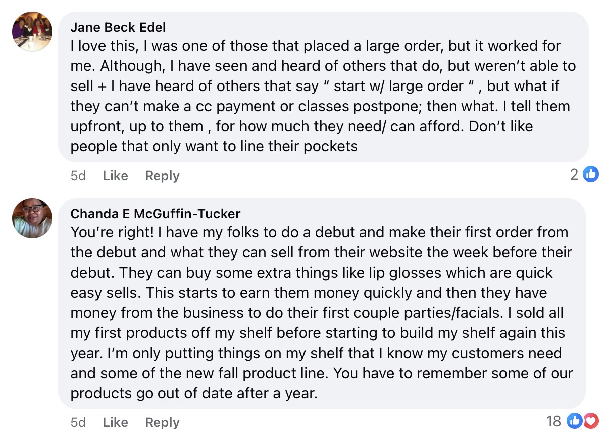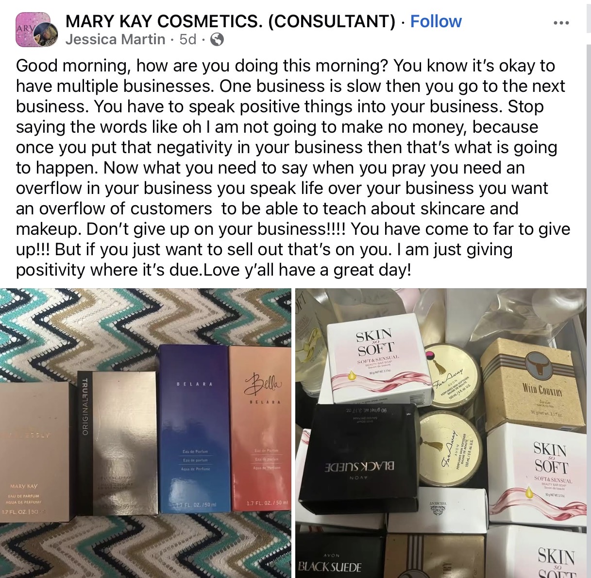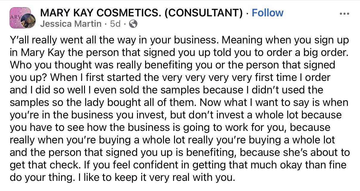 Jessica Martin took to Facebook to share her thoughts in a group for consultants. When you signed up for Mary Kay, and were advised to place a large inventory order, was that for your benefit or your upline? Clearly, Jessica realizes now that it’s the upline who benefits, not the consultant who places the big order.