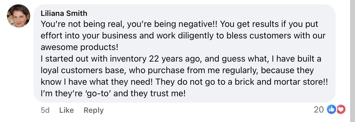 Liliana Smith helpfully shares that Jessica is being negative. You have to put in work to get results. She’s had a 22 year career in Mary Kay with several returning customers. I wonder how many consultants have such a track record?