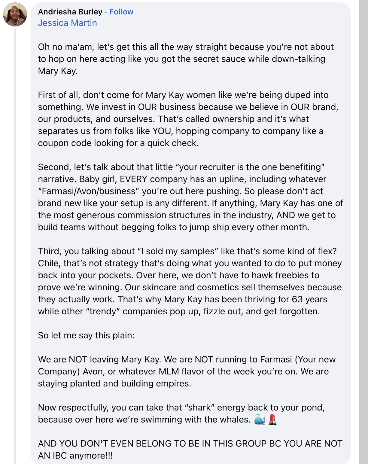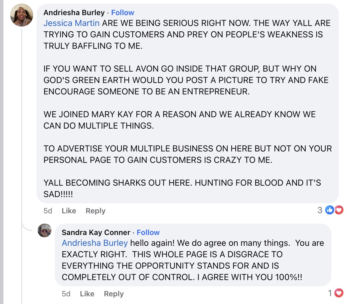 Andriesha then responded to that post and was appalled that Jessica would promote her other business in a Mary Kay group!