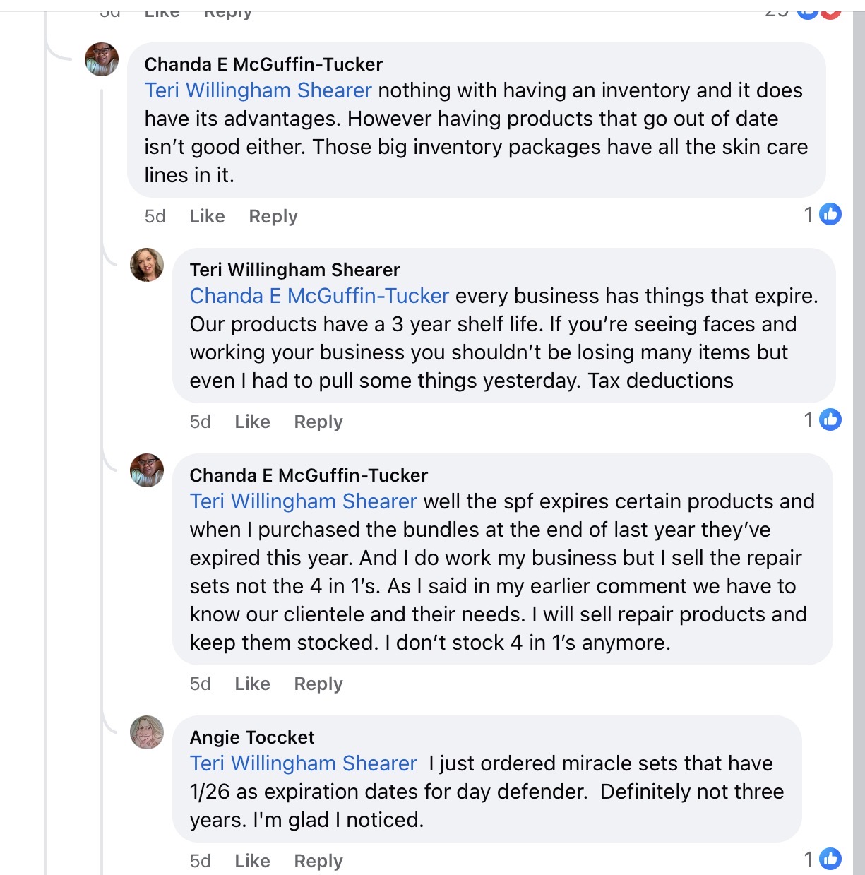 Not Yet NSD Teri Willingham Shearer compares Mary Kay to WalMart. She is glad when she shops at WalMart, that they have a fully stocked inventory. Chanda reminds her that products do expire, and you don’t want to have to toss expired product. Teri claps back that Mary Kay products have a 3 year shelf life. You should not have expired product if you are actively working your business and if you do, it’s a tax write off. Angie Toccket adds that she just received a Miracle Set that has product expiring in less than 5 months. If Mary Kay products fly off the shelf, why does the warehouse have such old product?