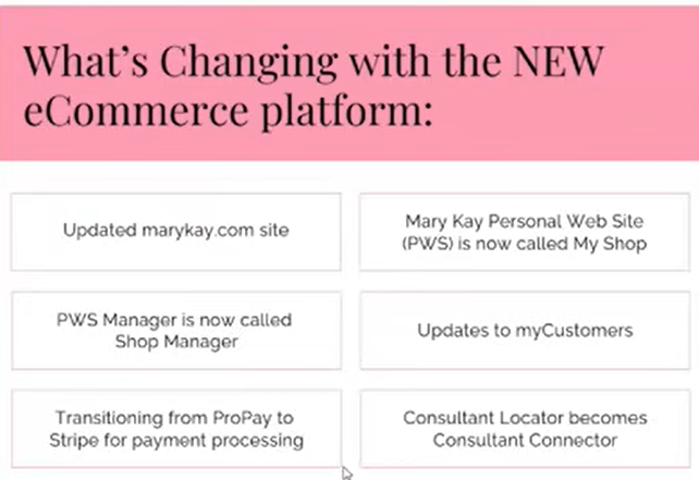 Mary Kay will be launching a new shopping experience. Currently, consultants had the option to have a Personal Website. Consultants with orders could choose to fulfill them through the CDS system (where the company sends the product to the customer) or by using their personal inventory. The new experience will be called My Shop. It will only allow orders to be fulfilled by CDS. Consultants won’t be able to fulfill online orders using their inventory.