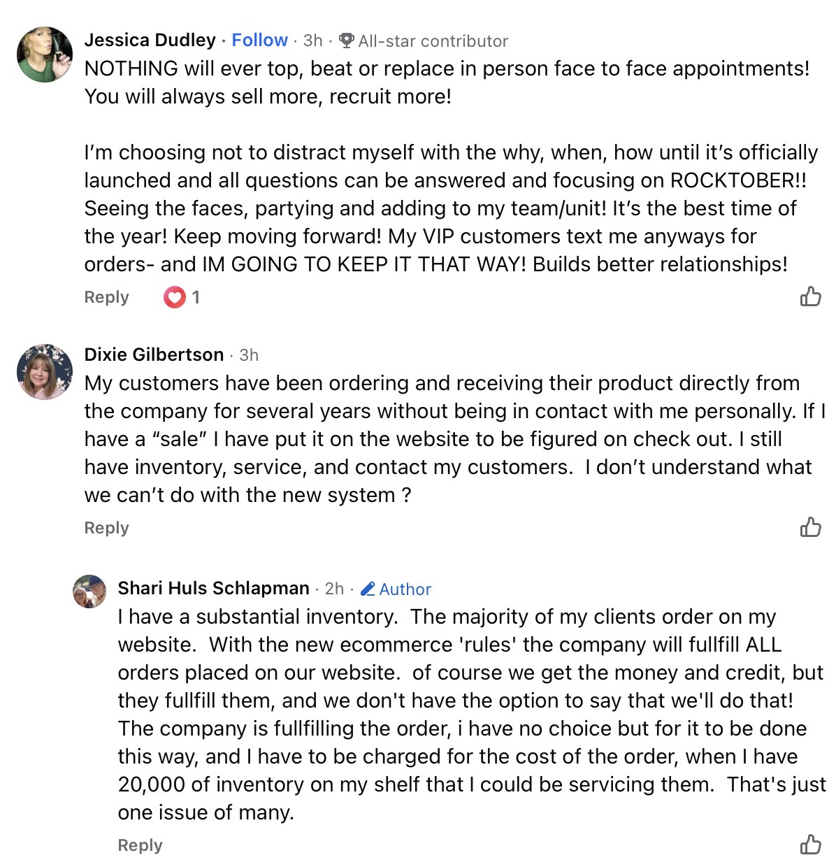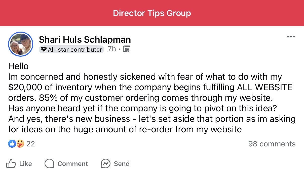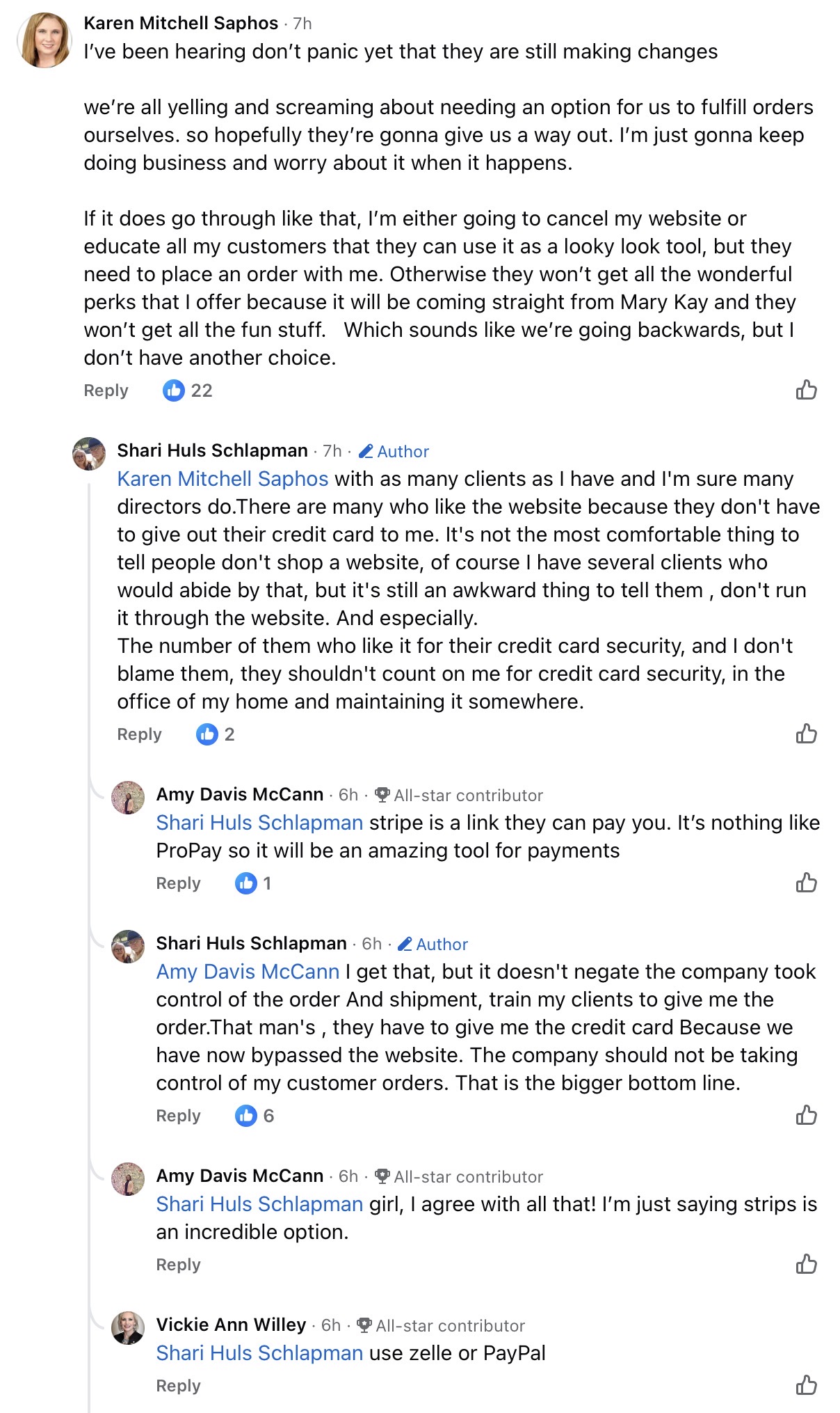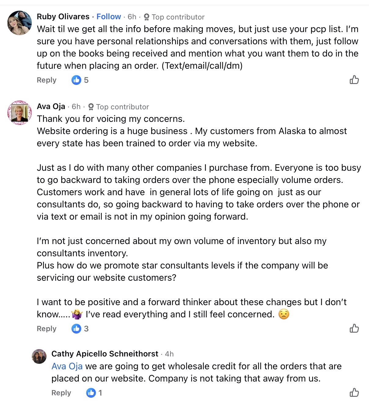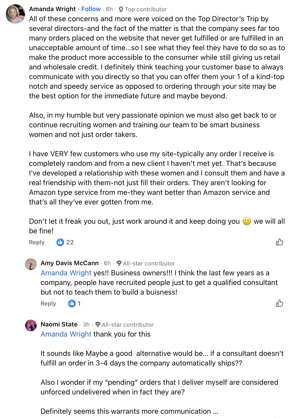 Amanda Wright drops in to mention that this topic was discussed on the recent Top Director’s Trip. The company’s response was that a lot of the website orders were never fulfilled by a consultant. They also saw a long delay in order processing. She feels that consultants need to focus on recruiting woman who want to run a business, as opposed to just taking orders. (See them saying the quiet part out loud: Do not focus on selling a product, focus on recruiting.) She has very few customers who use the website. Naomi State suggests that the company automatically ship orders in 3-4 days if the consultant doesn’t process it.