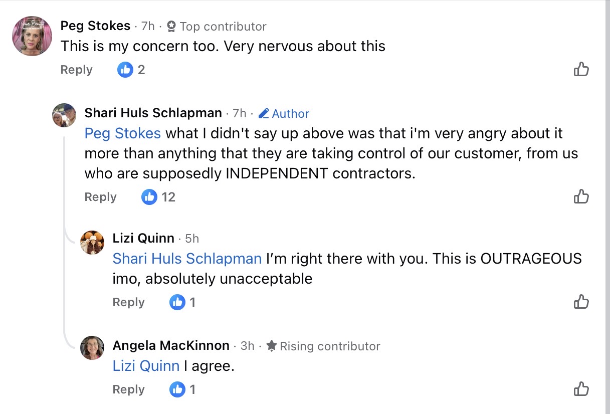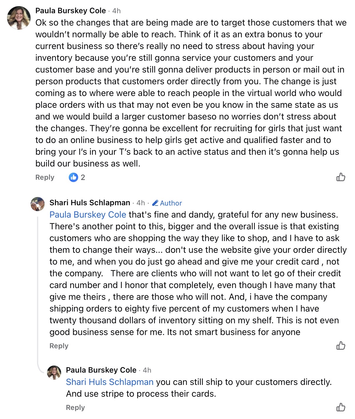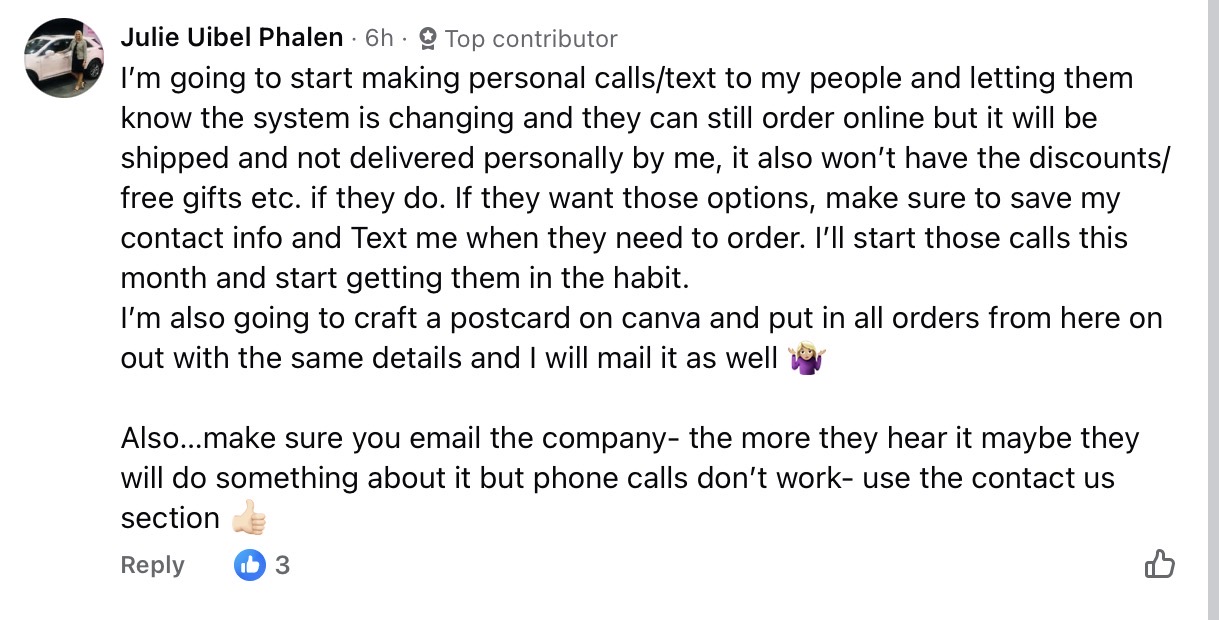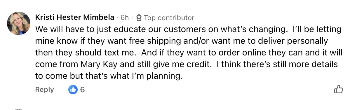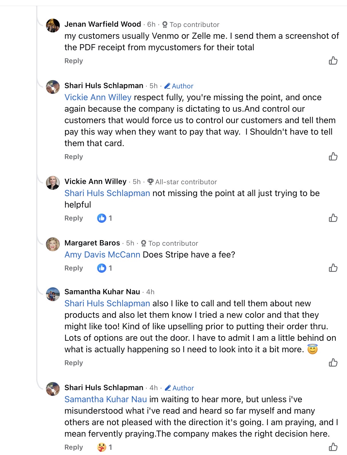 Amanda Wright drops in to mention that this topic was discussed on the recent Top Director’s Trip. The company’s response was that a lot of the website orders were never fulfilled by a consultant. They also saw a long delay in order processing. She feels that consultants need to focus on recruiting woman who want to run a business, as opposed to just taking orders. (See them saying the quiet part out loud: Do not focus on selling a product, focus on recruiting.) She has very few customers who use the website. Naomi State suggests that the company automatically ship orders in 3-4 days if the consultant doesn’t process it.