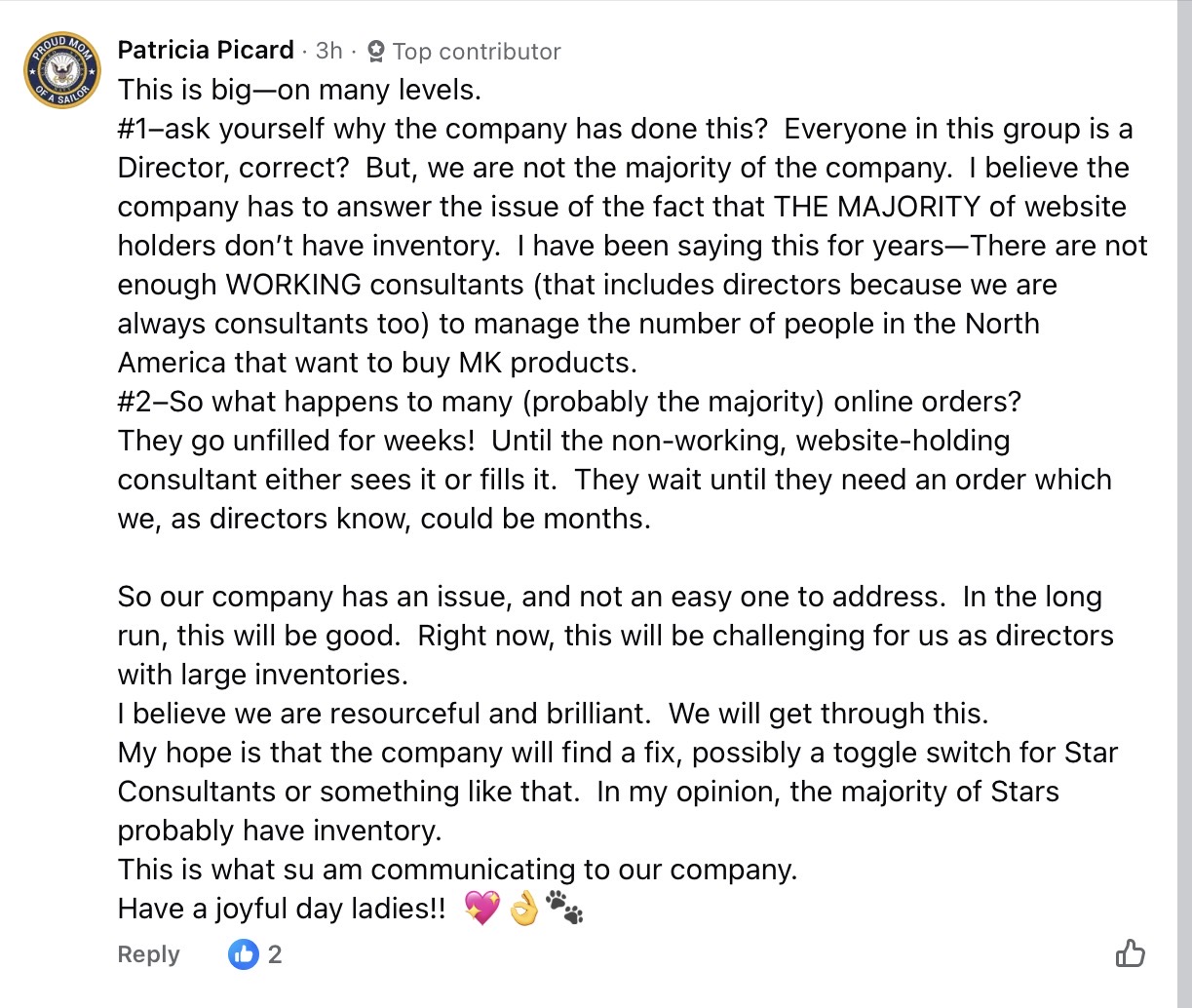 This one from Patricia Picard cracked me up: ““I have been saying this for years—There are not enough WORKING consultants (that includes directors because we are always consultants too) to manage the number of people in the [sic] North America that want to buy MK products.”