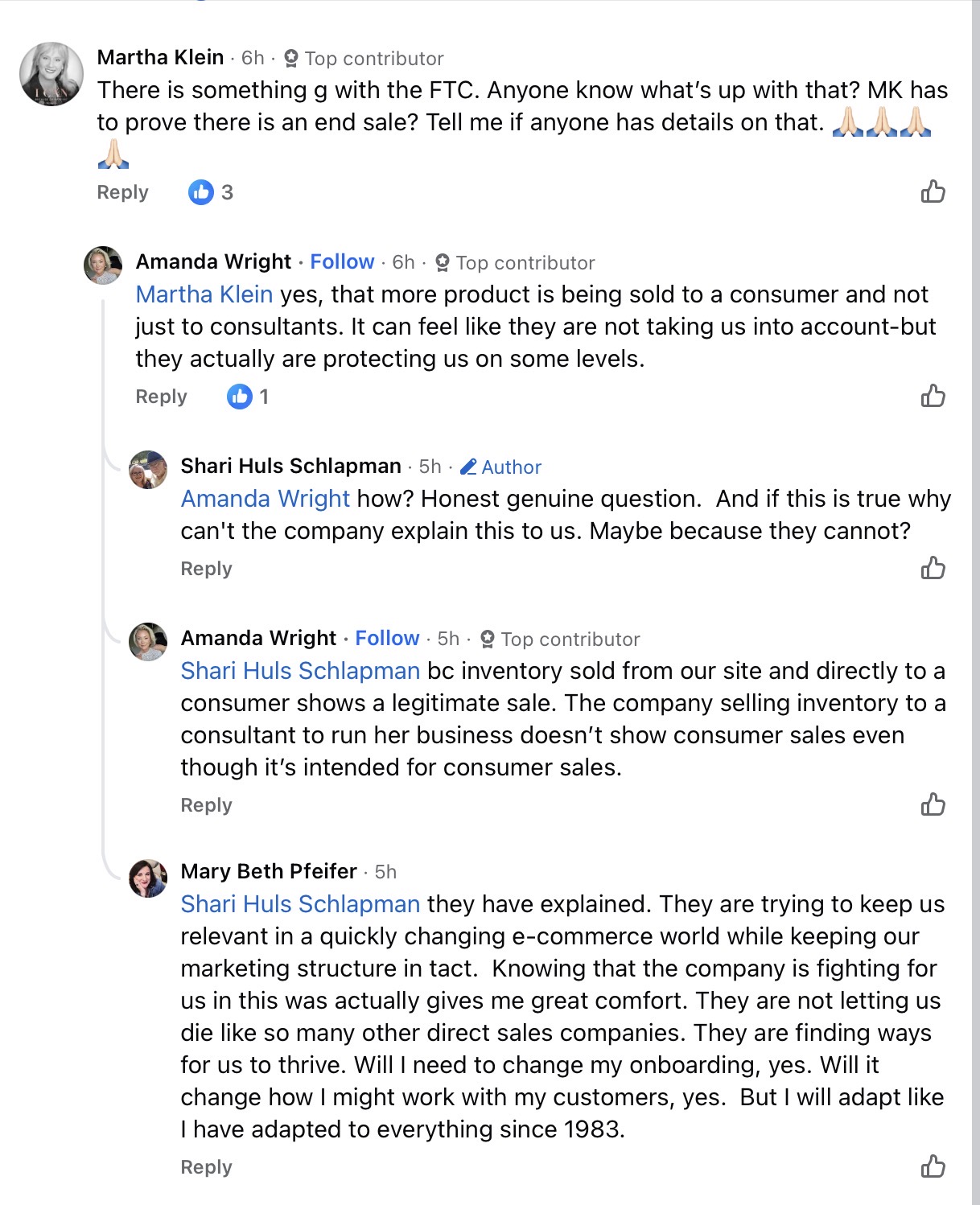 Martha Klein thinks that the FTC may have something to do with this change. Amanda Wright concurs. Mary Kay needs to be able to show orders are going to customers, and not to stockpile inventory that is never sold.