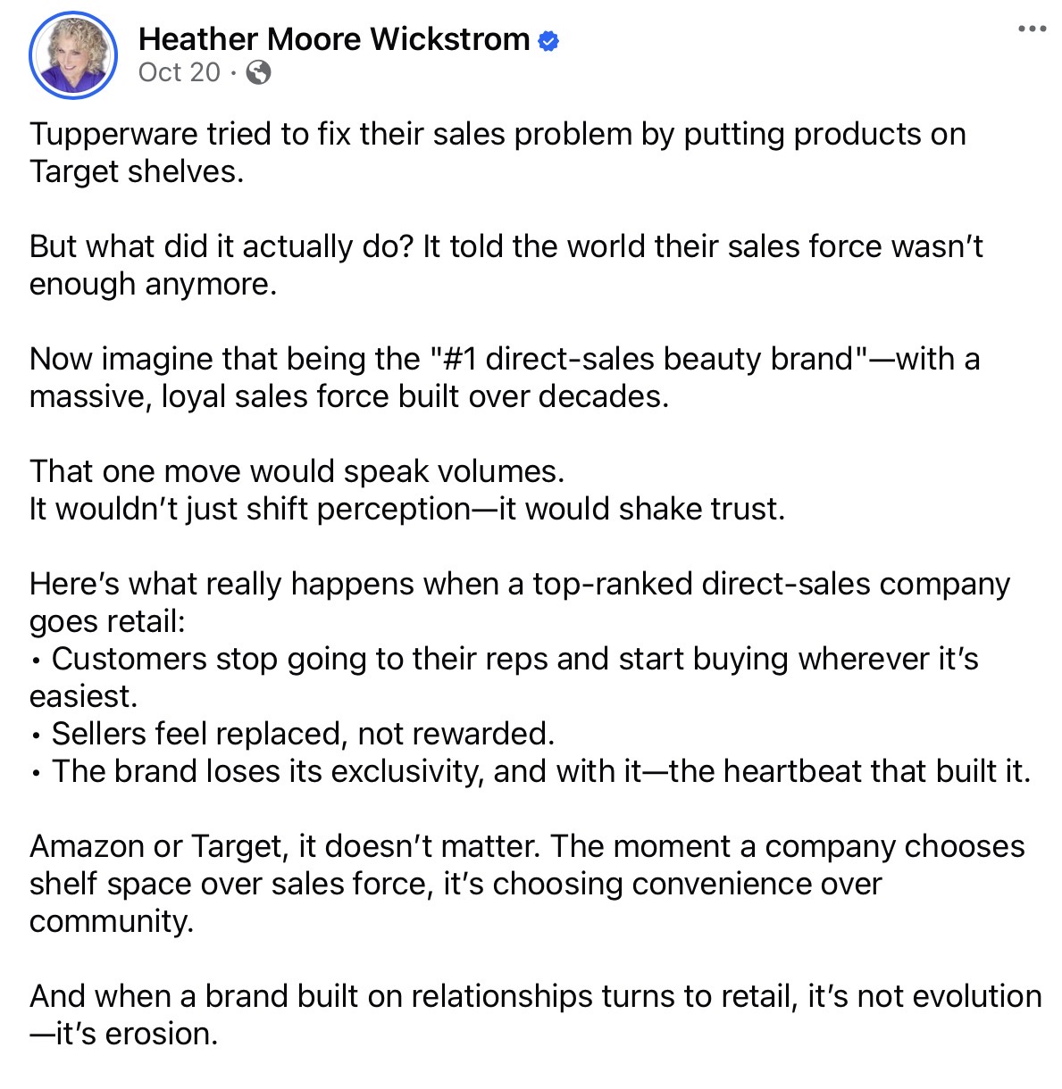 Heather Wickstrom, a terminated Mary Kay sales director and an old friend of Pink Truth, posted that she is concerned “the #1 direct sales beauty brand” is going to eliminate their sales force. Tupperware began selling their product at Target. Customers stopped buying from their reps. This erases the trust reps have in their company.