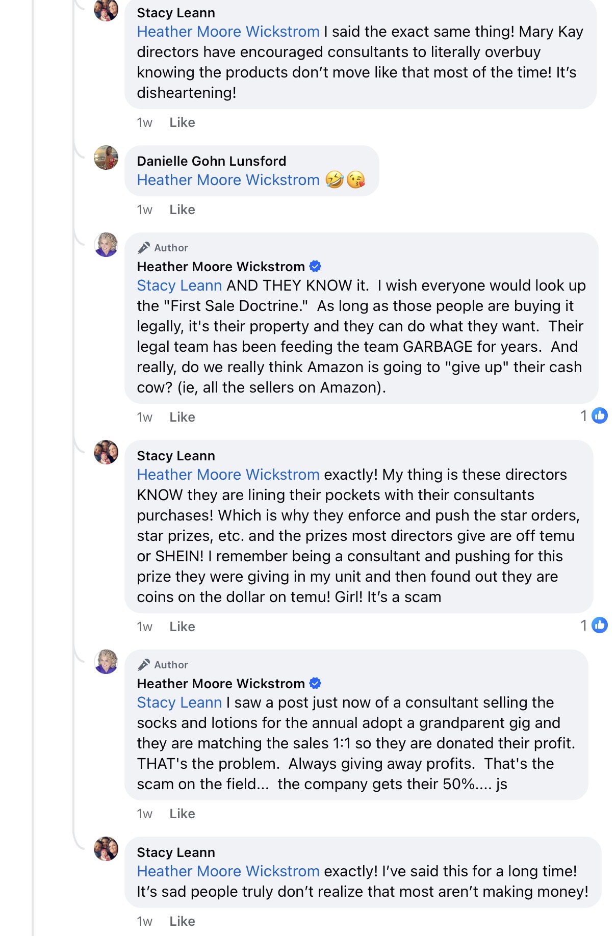 Stacy Leann agrees with Heather. Too many directors encourage their downline to order too much inventory. Heather says the company is aware. If someone buys Mary Kay product, they own it and can resell it wherever and however they want it. She also states she doesn’t believe Amazon will do anything about the resellers. Stacy then mentions how directors give Temu and Shien products for ordering recognition that only cost them pennies on the dollar. Heather brings up the adopt a grandparent hustle and says that it’s always the consultant who has to give up their profit. Never Mary Kay.