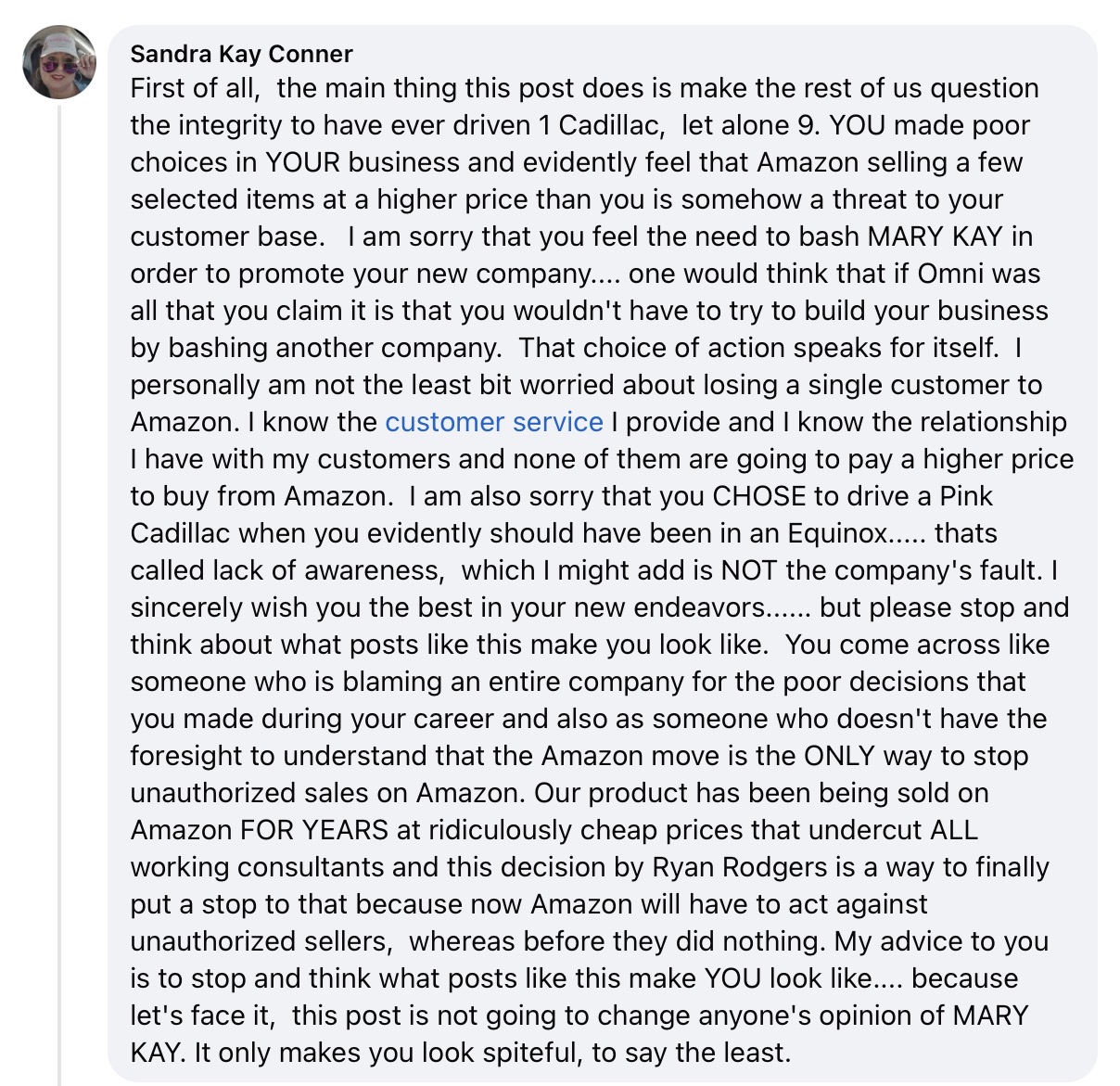 Sandra Kay Conner jumps in to question Heather’s integrity. What ethical concerns did she overlook to earn her 9 Cadillacs? If her new company is so great, why does she consistently feel the need to bash Mary Kay? If she had to work so hard to earn a Cadillac, maybe she should have been content to settle for the Equinox.