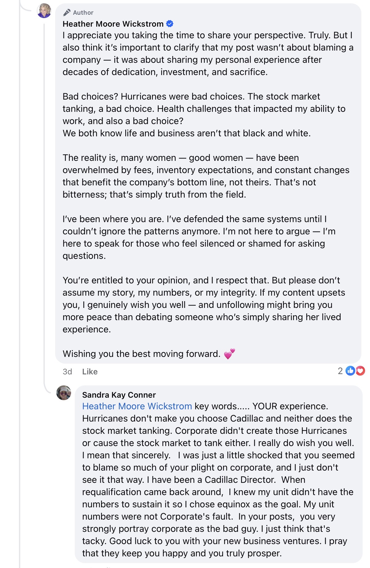 Heather replies that she doesn’t blame the company, she just wants to share her personal experience. Sandra Kay then adds that any failures she’s had in Mary Kay are all her fault, not corporate.