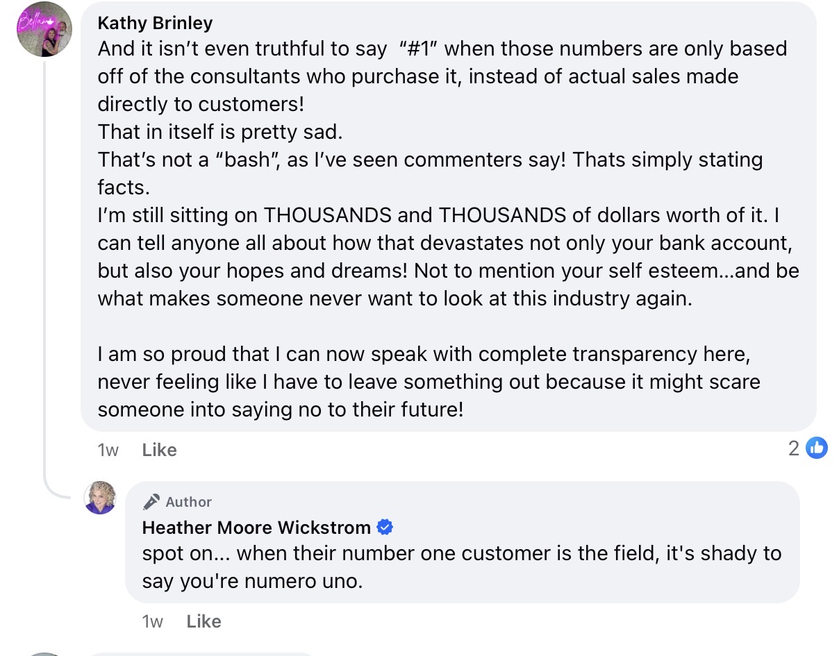 Kathy Brinley reminds everyone that the #1 designation is based on inventory orders to consultants. Mary Kay does no tracking of retail sales to customers. She is sitting on thousands of dollars of unsold inventory.