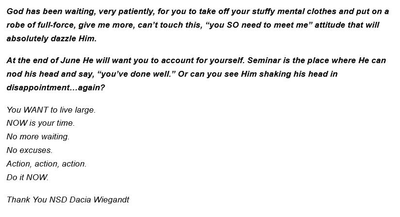 Dacia sent this message to her team in 2007. She implored her team that God needed them to order and would hold them accountable at Seminar.