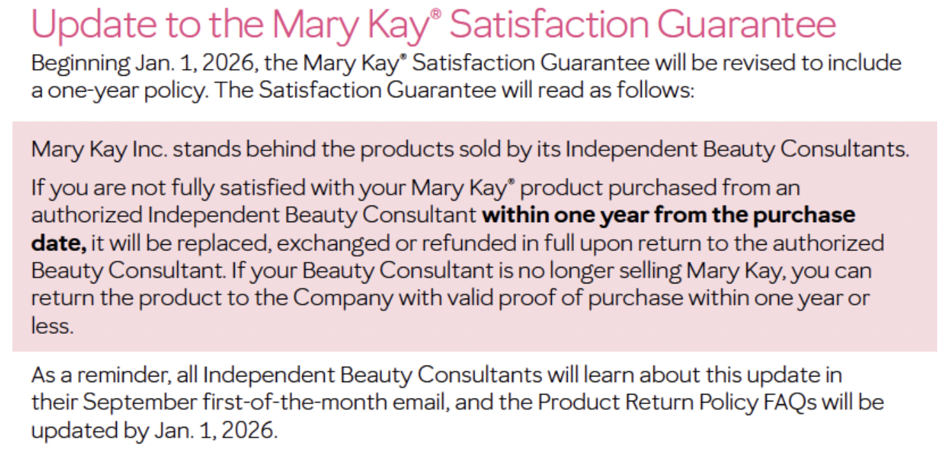 Now Mary Kay is changing things up, and only honoring returns within one year of purchase.