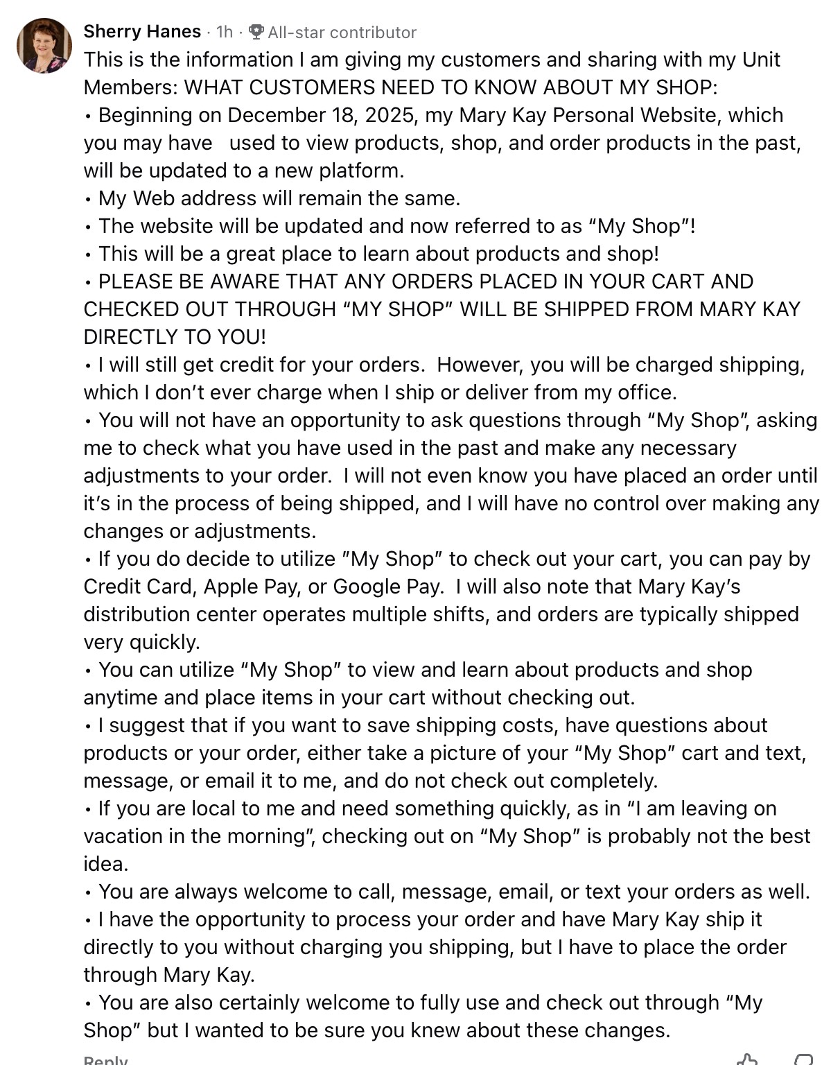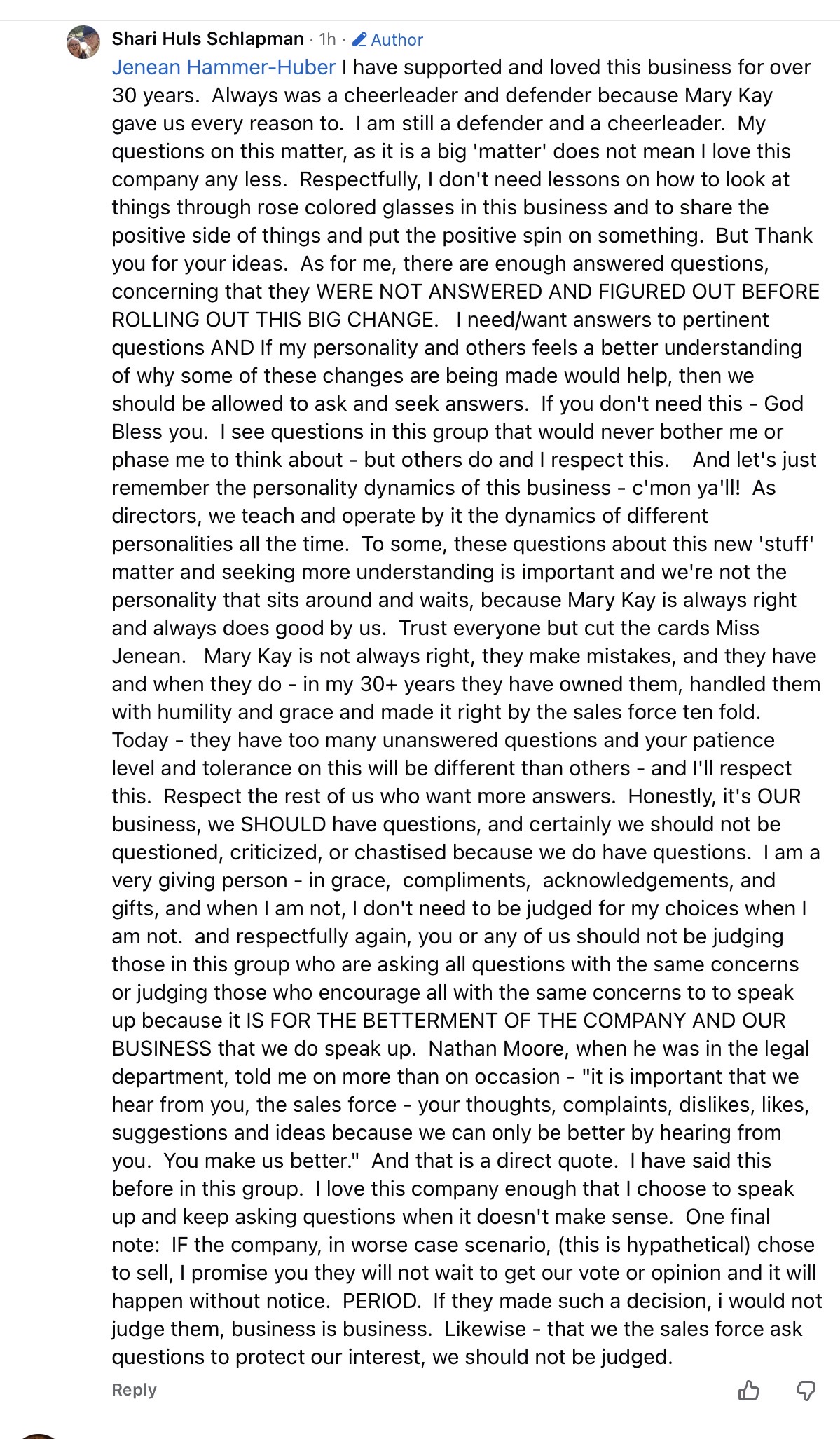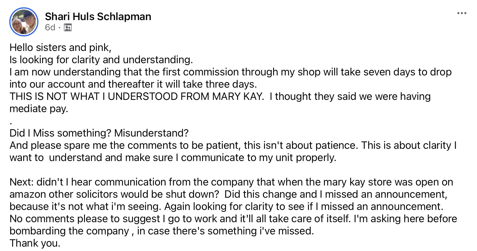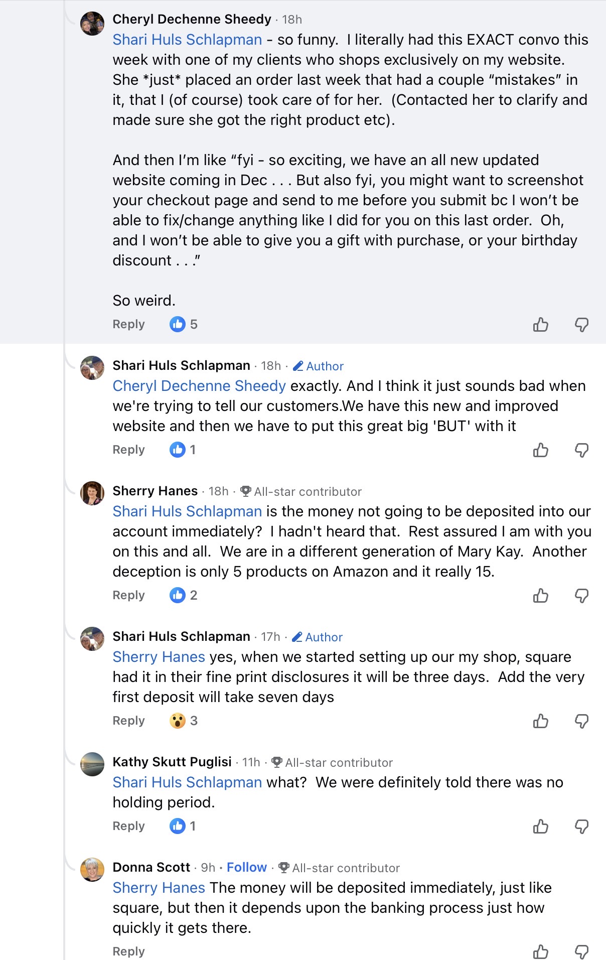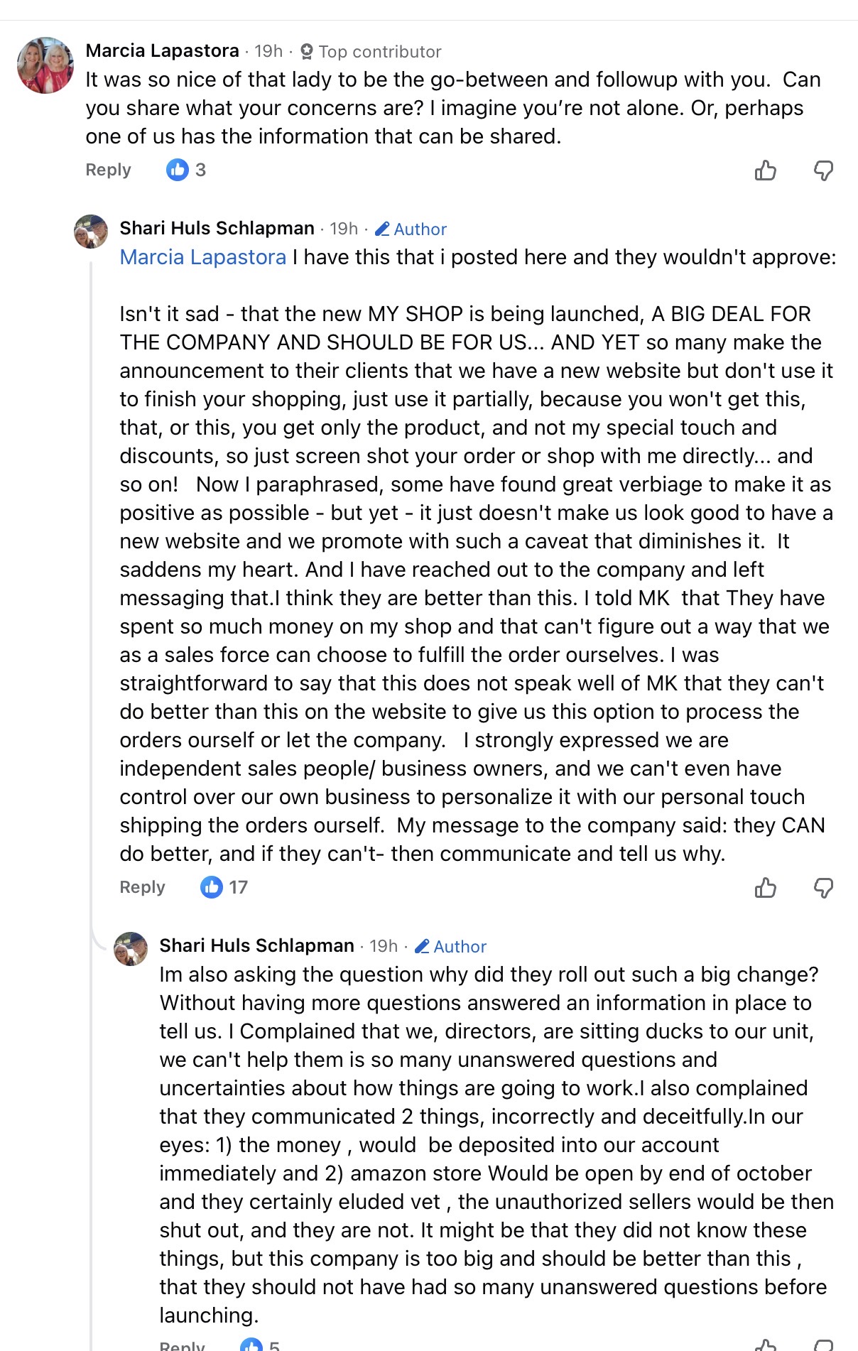 Mary Kay sales director Shari Schlapman is still worried how she will sell her $20,000 worth of inventory once Mary Kay My Shop launches on December 17th. She is also concerned that payments for online orders will take three days to be deposited in consultant’s stripe accounts. She is also puzzled that there are still unauthorized sellers on Amazon.