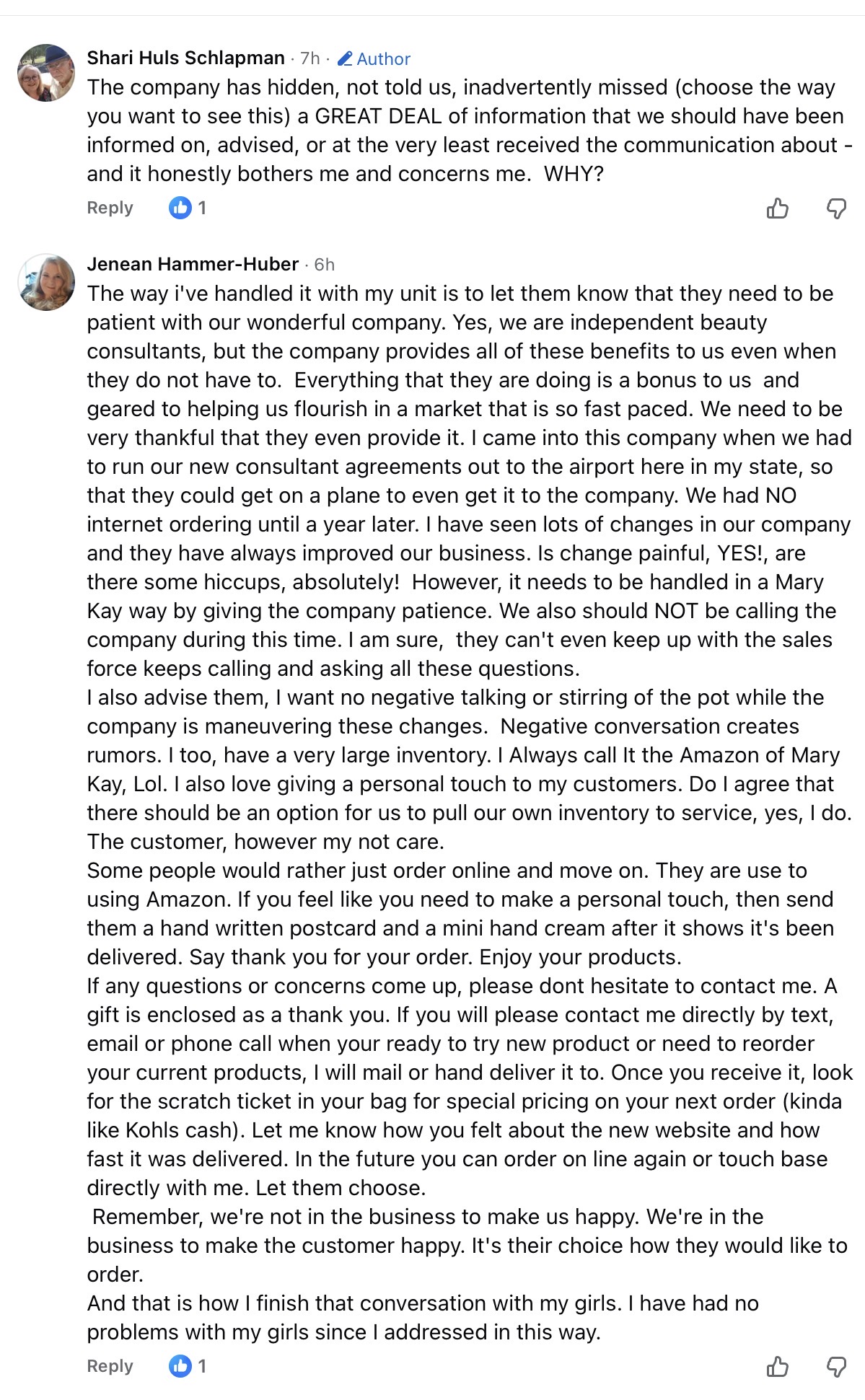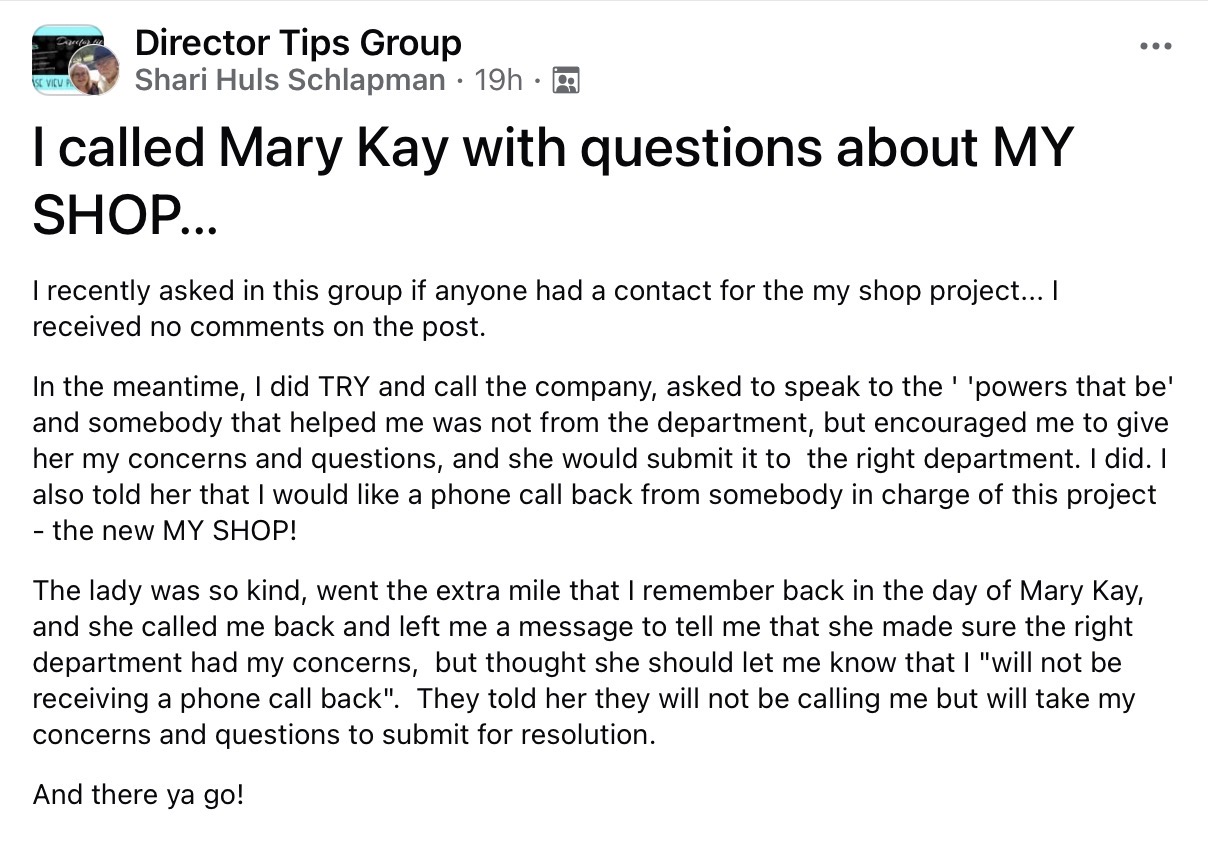Marcia Lapastora was happy that Shari got to speak to someone. She would like to know what Shari’s concerns are. Shari is still upset that the new My Shop will not allow a consultant to fill an online order from their inventory. She is an independent business owner and Mary Kay is taking away her control of her business. She needs answers for her team. (And remember, she’s got $20,000 of products that she over-ordered, and those need to be unloaded!)
