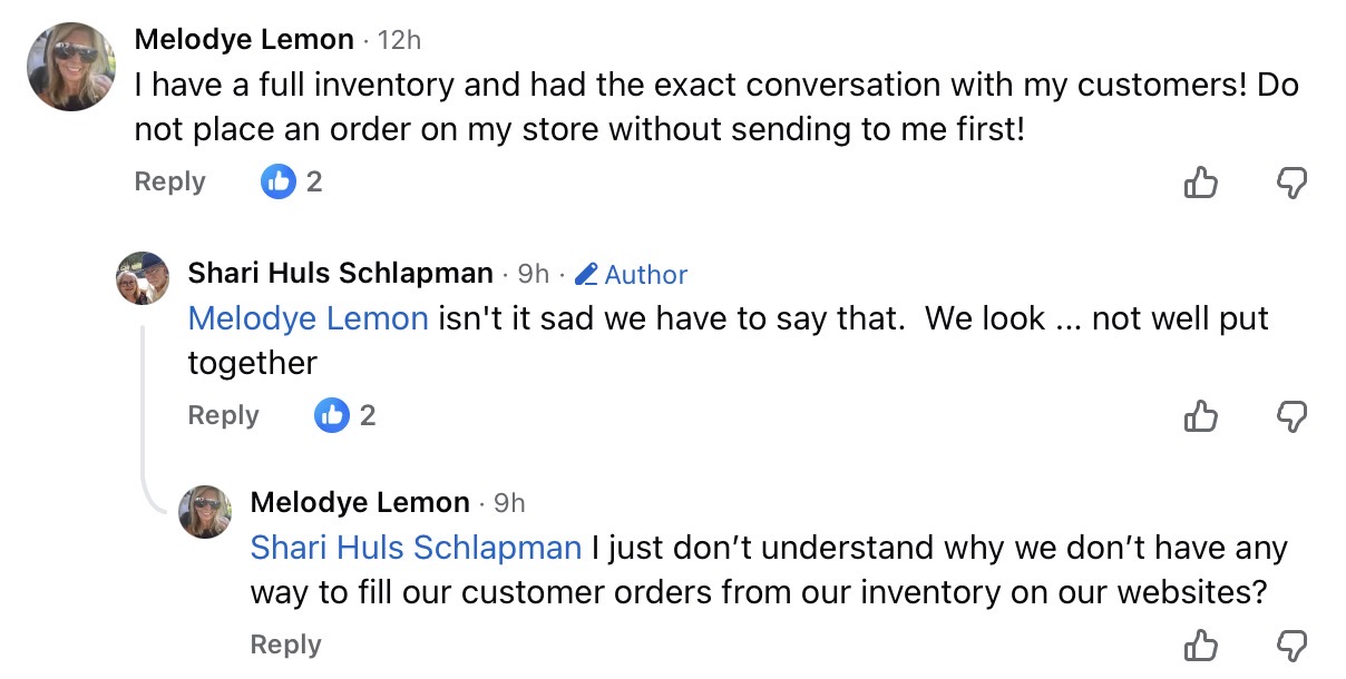 Melodye Lemon laments that she also carries a full inventory and she will be advising customers not to use the website. Why won’t Mary Kay let her use her inventory for website orders? (Because this is a huge move in the direction of an affiliate model!)
