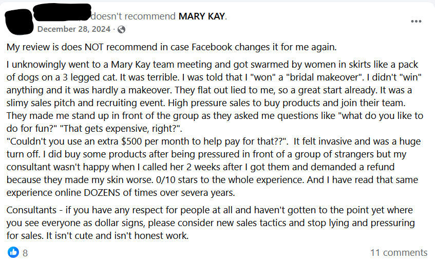 It’s bad enough when they trick you into a “makeover” that’s really a Mary Kay party where you put on your own makeup. But when they trick you into a coming to a recruiting event, calling that a makeover, it’s even worse.