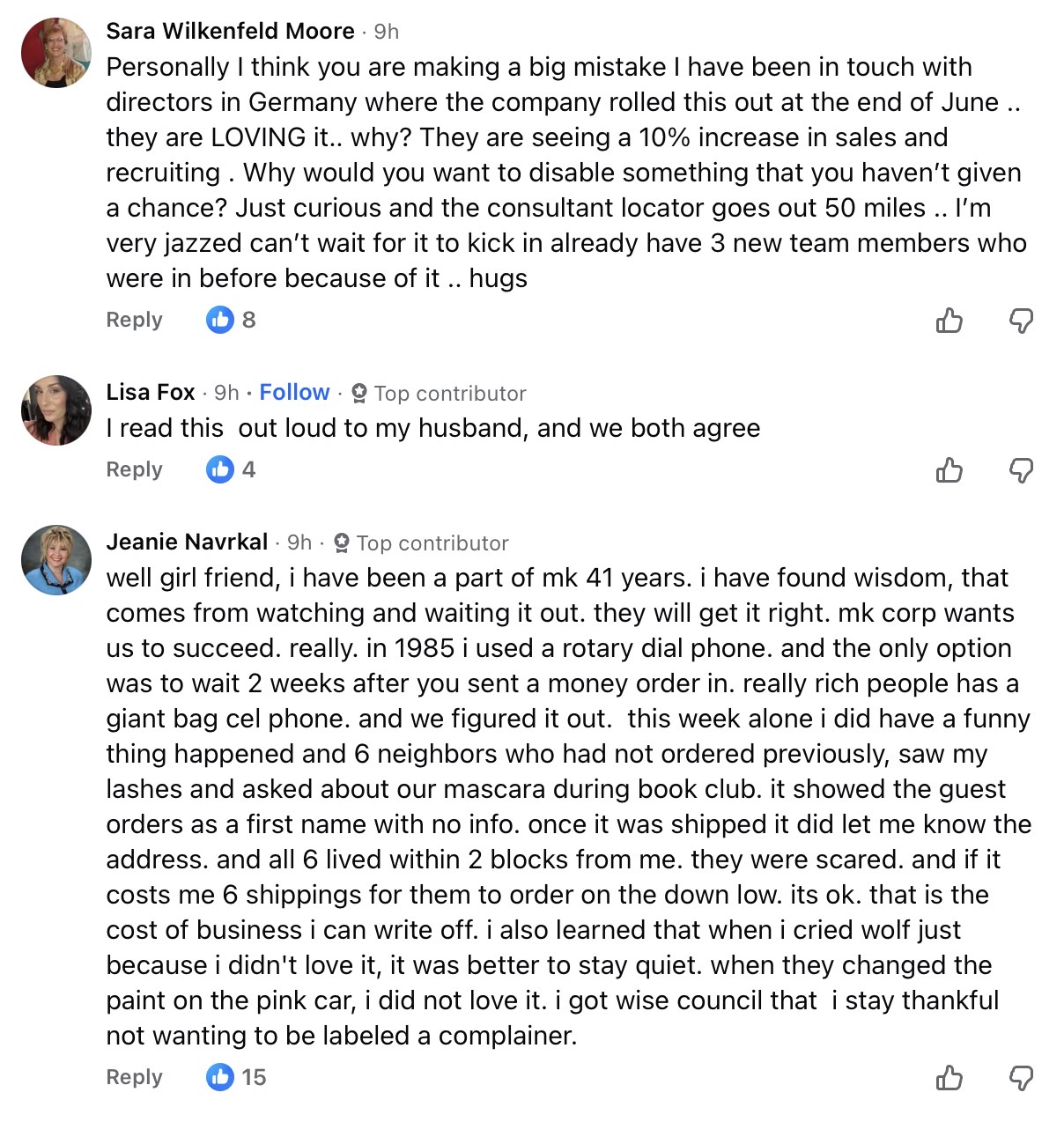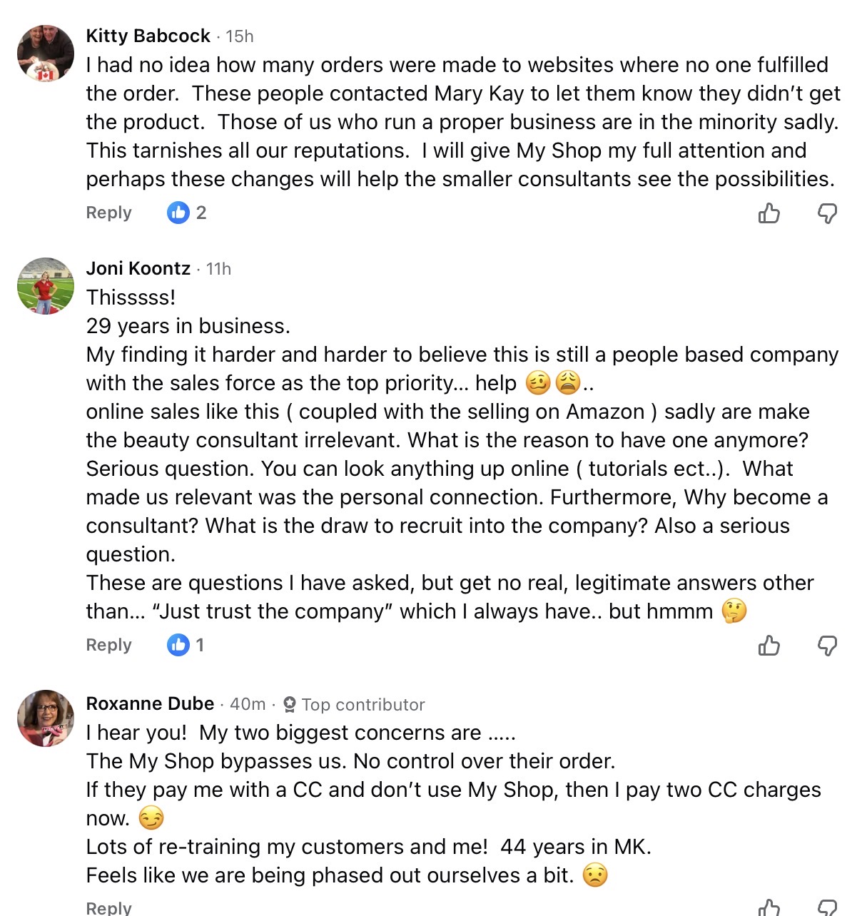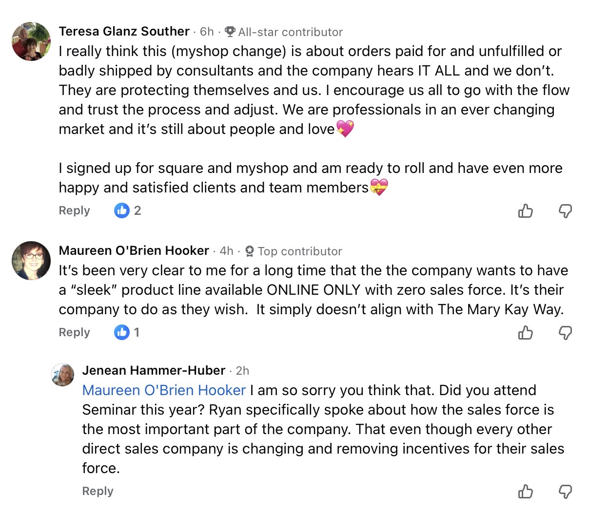 Teresa Souther puts down her Mary Kay koolaid to share that everyone should just trust the process. Maureen O’Brien Hooker feels that Mary Kay wants to only have an online presence with ZERO sales force. My Shop is not the Mary Kay way. Jenean Hammer-Huber reminds Maureen that Ryan mentioned at Seminar that consultants were the most important part of Mary Kay.