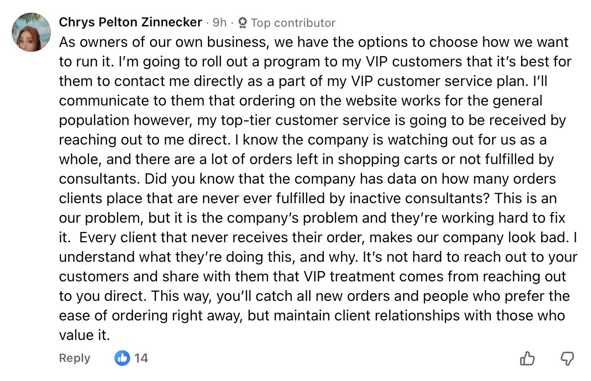 Chrys Zinnecker will let her customers know that if they want to participate in her VIP program they must contact her directly. Mary Kay is making this change because too many consultants were leaving their online orders unresolved – which reflects badly on the company.