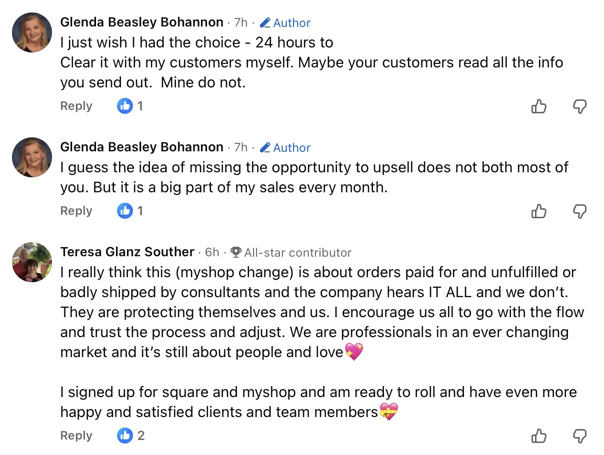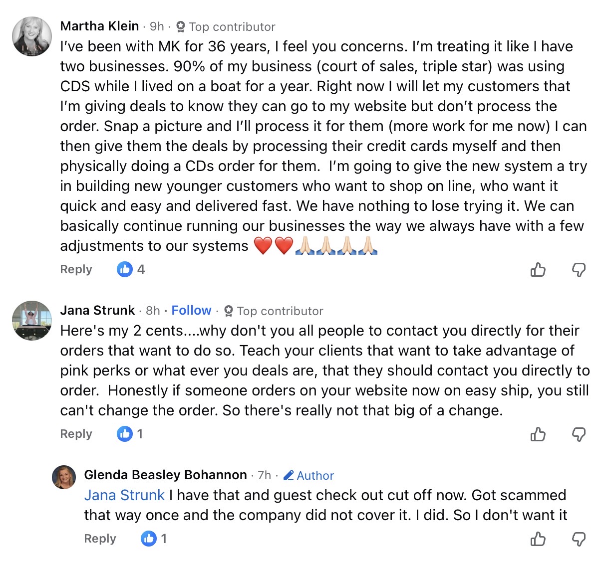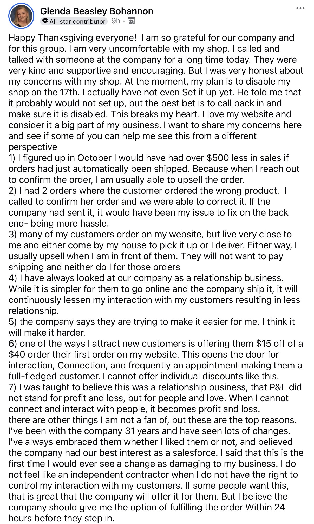 Glenda Bohannon is a Mary Kay sales director who has been in the company for 31 long years. In a lengthy post on Facebook, she explains why she won’t be using the My Shop feature when it rolls out on December 17th. (entire post here, my TLDR notes below)