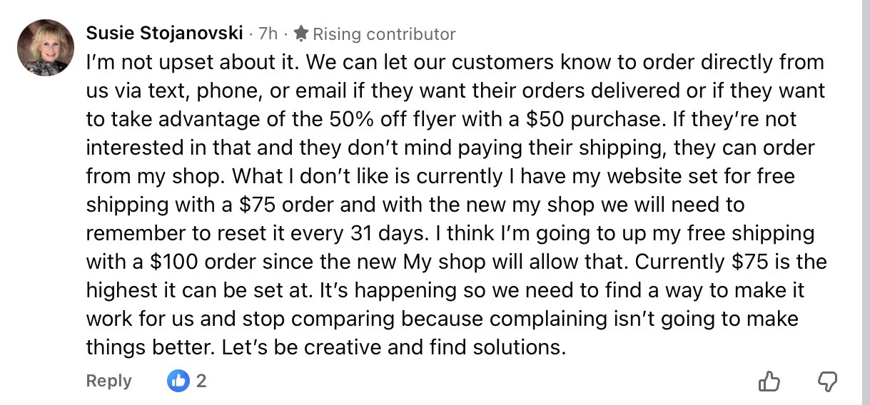 Martha Klein has been selling for 31 years. She has the mindset that she will now have two businesses. She will continue to service her current customers but hopes that My Shop will attract newer customers who prefer to shop online. Jana Strunk says Glenda should just train her customers to contact her directly. Glenda unfortunately was burned by guest check out. An order was placed by a scammer and Glenda had to eat the cost.