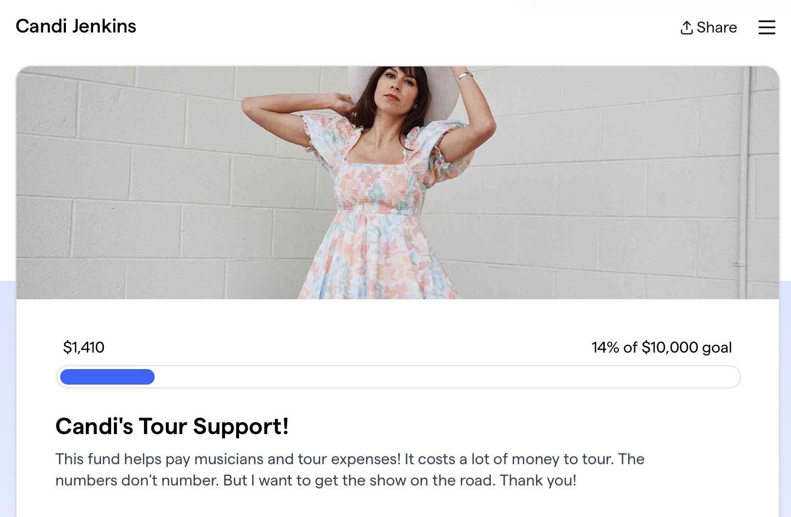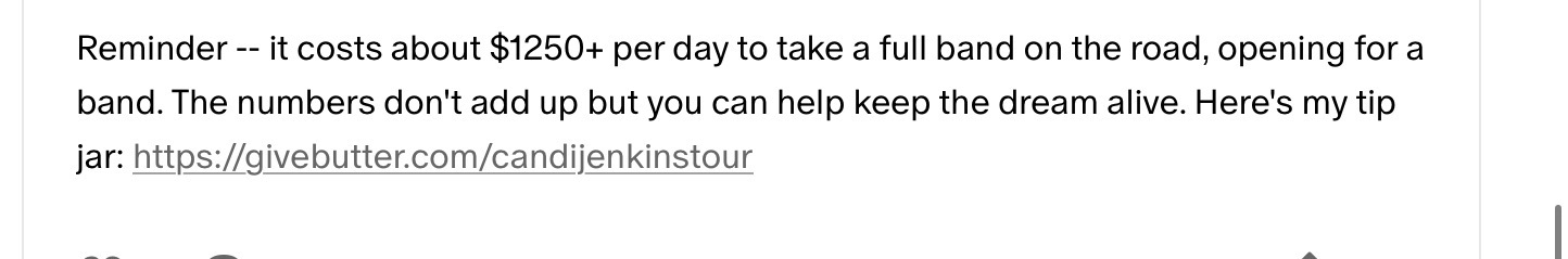 Linda’s daughter Katie Candi Jenkins Toupin inherited her mother’s first line unit when Linda “retired”. However, she’s still trying to make Candi Jenkins happen. She recently posted on her Patreon that it costs $1250 a day to take a full band on the road. If you’d like to help, she has a tip jar. It currently has raised $1410. So much for executive income.