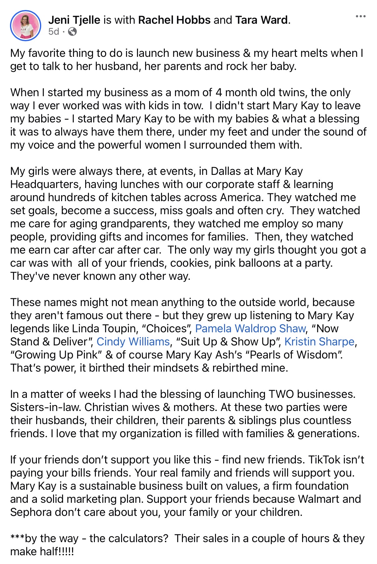 Jeni recently helped two sister in law’s start their Mary Kay businesses. Each debut was filled with the new consultants’ family and friends. She then condescendingly says – if your friends don’t support your new business that you need to find new friends. Wal Mart, Tik Tok and Sephora don’t care about your family.