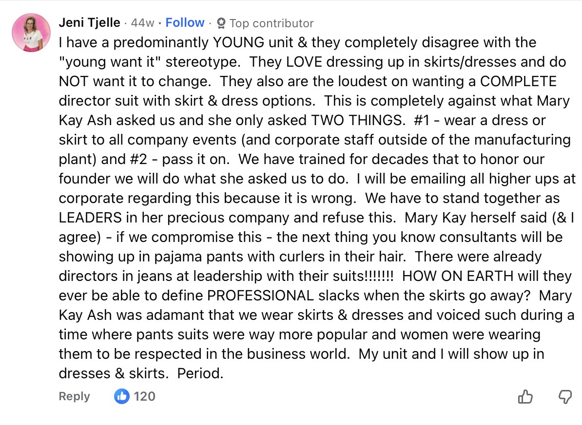Also, if you’re thinking of joining Jeni’s unit she will expect you to wear a skirt or dress at any corporate event sponsored by Mary Kay. I wonder if she shares this before or after their initial inventory order.