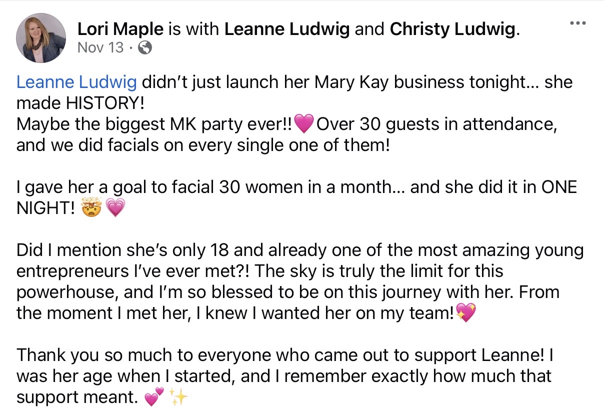 Lori Maple brags that her new 18 year old consultant had what was most likely the biggest debut party ever. She had a goal to do 30 facials at the party – and she did! (Although most of the guests look to be under 18 so do they really count?) Lori doesn’t share how much this consultant sold.
