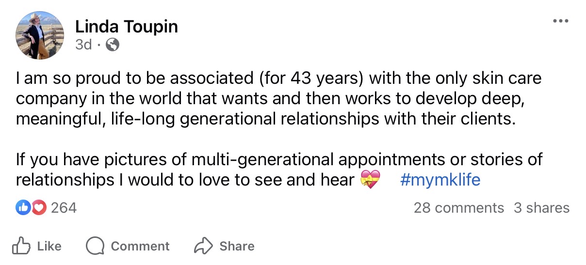 Retired* national sales director Linda Toupin recently asked consultants to post pictures of their Mary Kay parties. Mary Kay is the ONLY skin care company that cares about the multi generational relationship with customers.