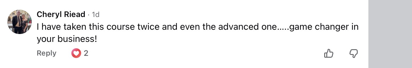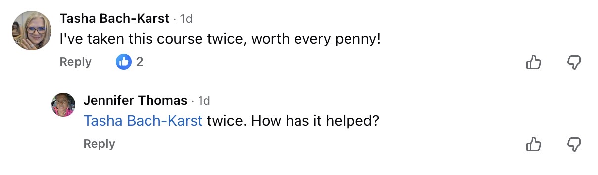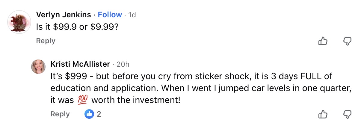 Verlyn wants to confirm the price. Is it $9.99 or $99.90? Nope, Kristi shares that the price is indeed $999. But she’s also taken the class before and highly recommends it.