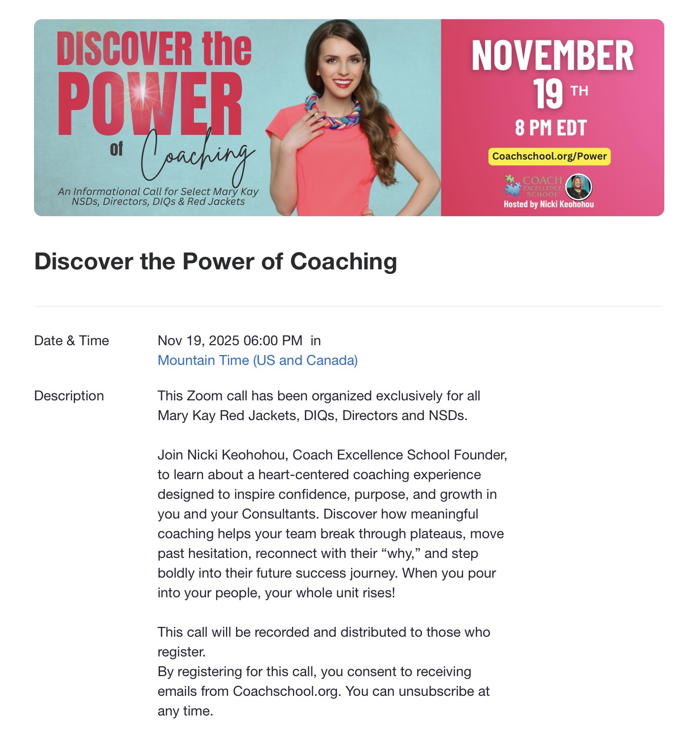 My director had hired a “coach” to help the unit move up the career path and there were no new strategies. Thankfully, she paid for it so it didn’t come out of my pocket because they just regurgitated the “book, coach, sell, and recruit” loop in different words and tried to put fire under our behinds to take action. Most of her info was about dressing your best, perfecting your “I” story, calling 100 people a day to make sales, and bragging about all of the stuff she was able to buy from her MK checks. She was pretty aggressive in her approach to try and motivate people. It was such a waste. I bet this will be something similar.