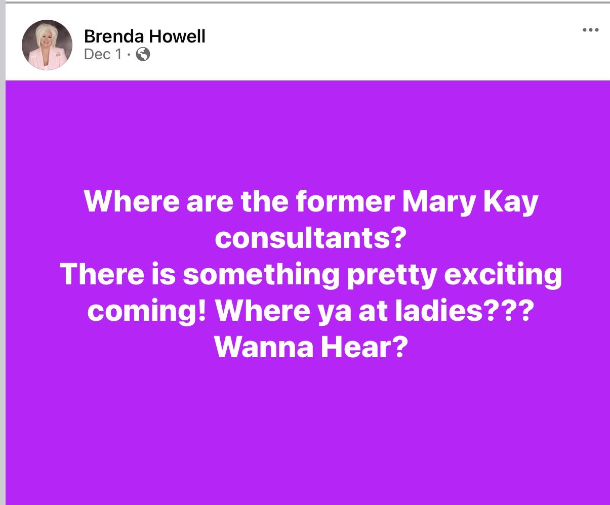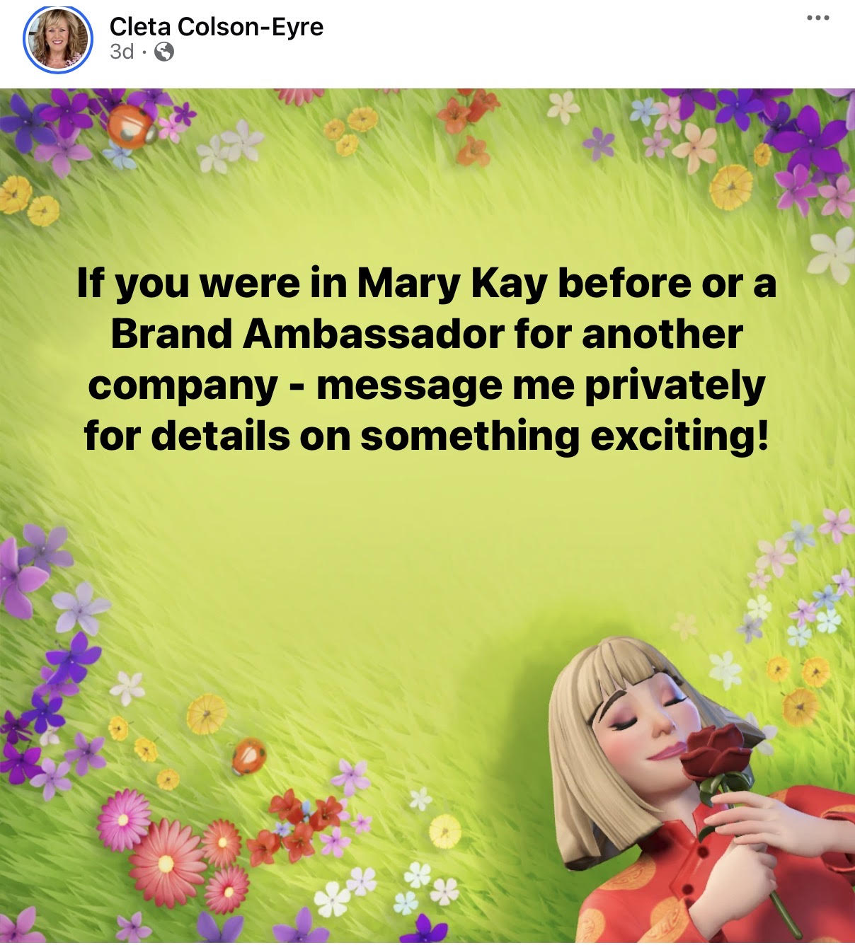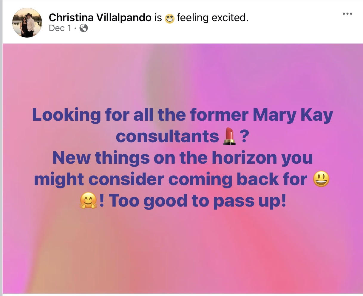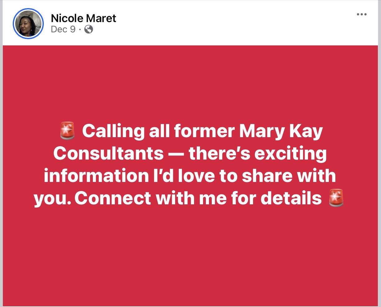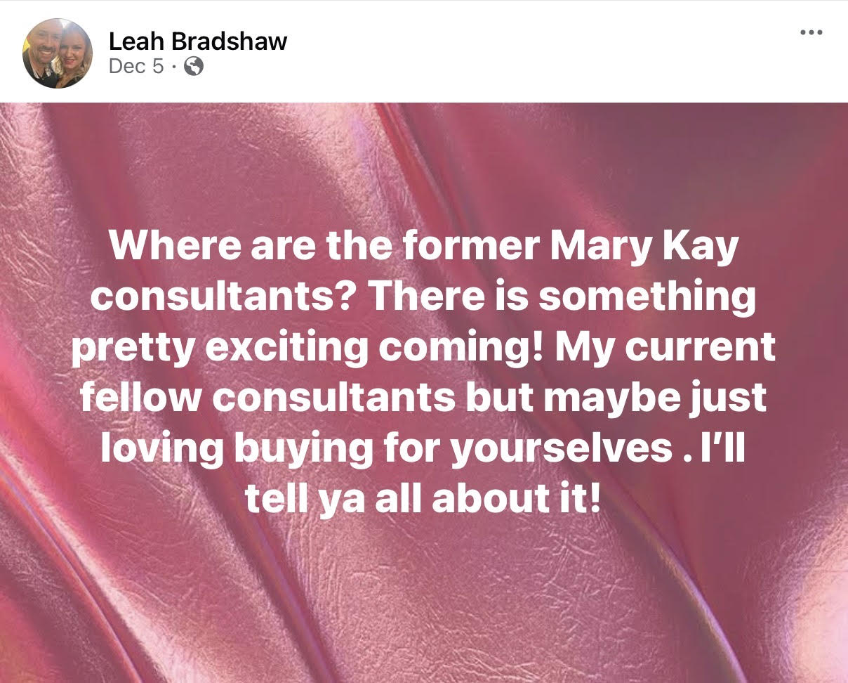 Desperate to receive any type of commission from a downline, they’re marketing this opportunity to anyone and everyone. Mary Kay recruiters started calling out to former consultants. They teased something new to get them interested in coming back. Why? Because a former consultant is easier to recruit than someone who has never been in MK before.