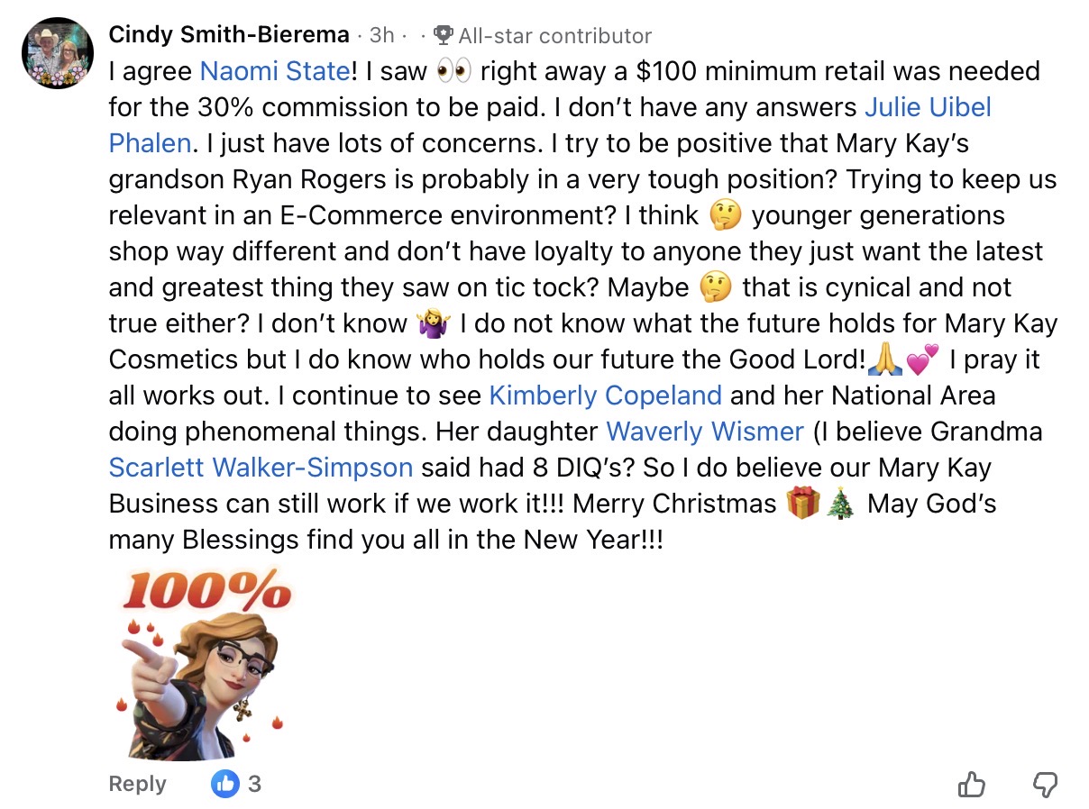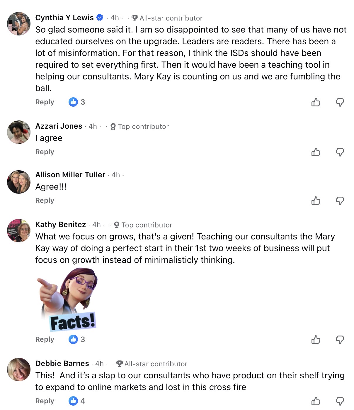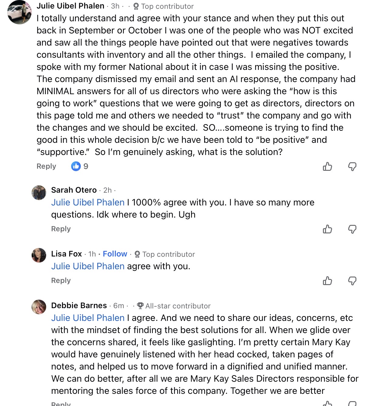 Julie Phalen has been emailing the company constantly since September when this change was announced. She’s even spoken with her former nsd (her mother Sue) and the company is not listening. She’s gotten just one AI written email in response. Debbie jumps back in to say Mary Kay herself would not be doing this to her consultants.She would be listening to everyone and it’s up to the directors to make sure they’re leading the company,