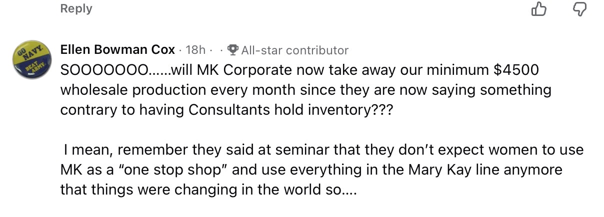 And finally Ellen Bowman Cox wonders is Mary Kay will remove the $4500 inventory requirement for directors because My Shop doesn’t focus on inventory orders. (Wait! Is this admitting that production is done through orders for inventory rather than order for products consultants are selling?)