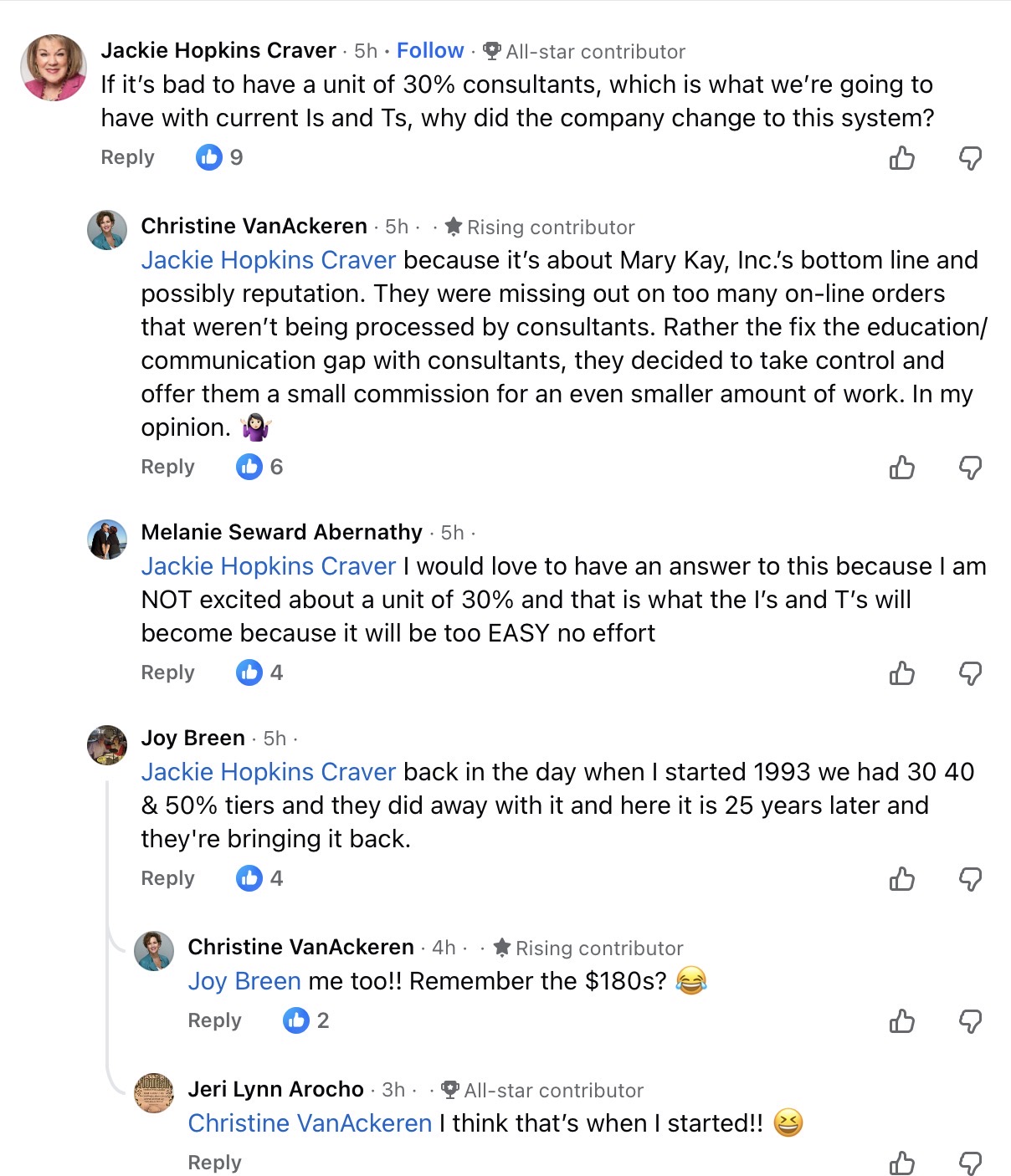 Jackie Hopkins Craver admits that her unit of inactive and terminated consultants will now receive 30% on any order. Christine VanAckeren thinks that this change was made because too many Mary Kay consultants were not closing out and fulfilling website orders. She does not feel that Mary Kay made the best decision to fix this problem .