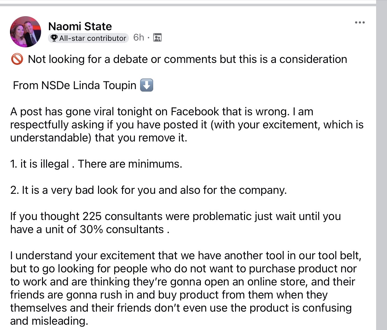 There were several messages in response. Karen Saphos is worried that people will recruit former consultants to sign up under them without pointing them back to their original consultant.