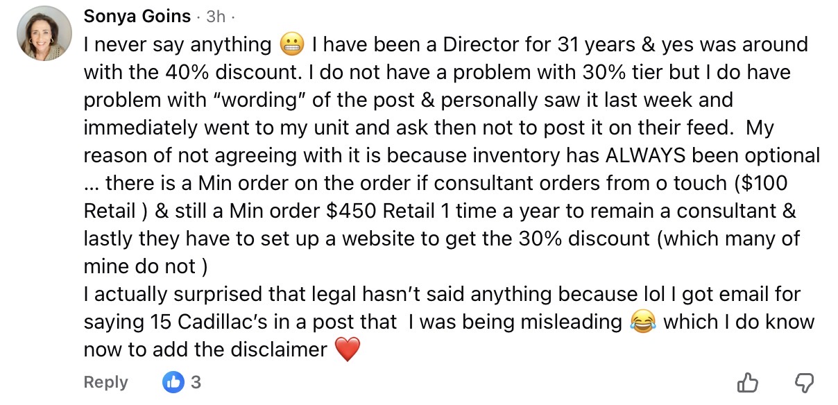Sonya Goins once got a warning from Mary Kay from one of her posts about driving a Cadillac. Why aren’t they monitoring what consultants are posting?