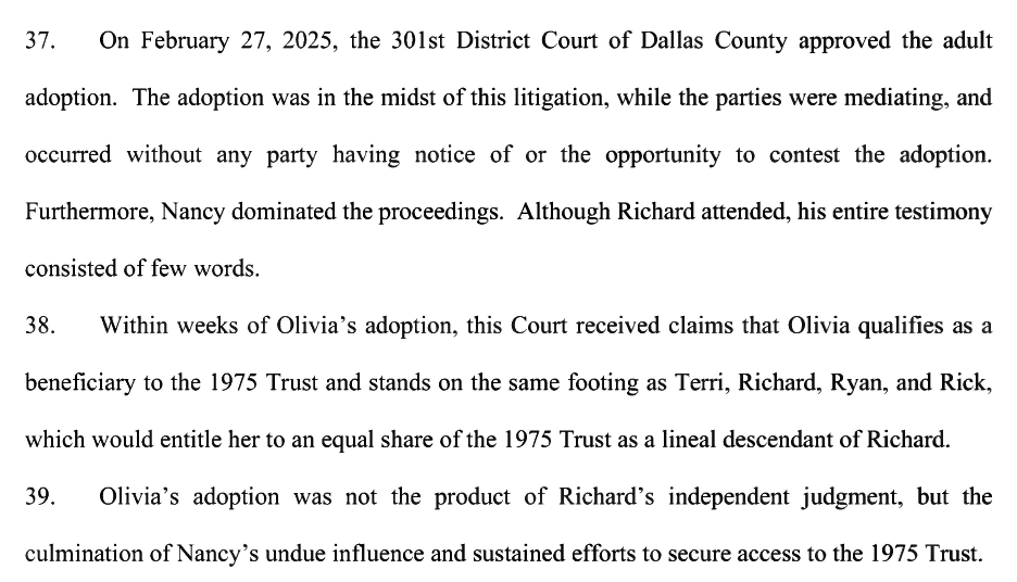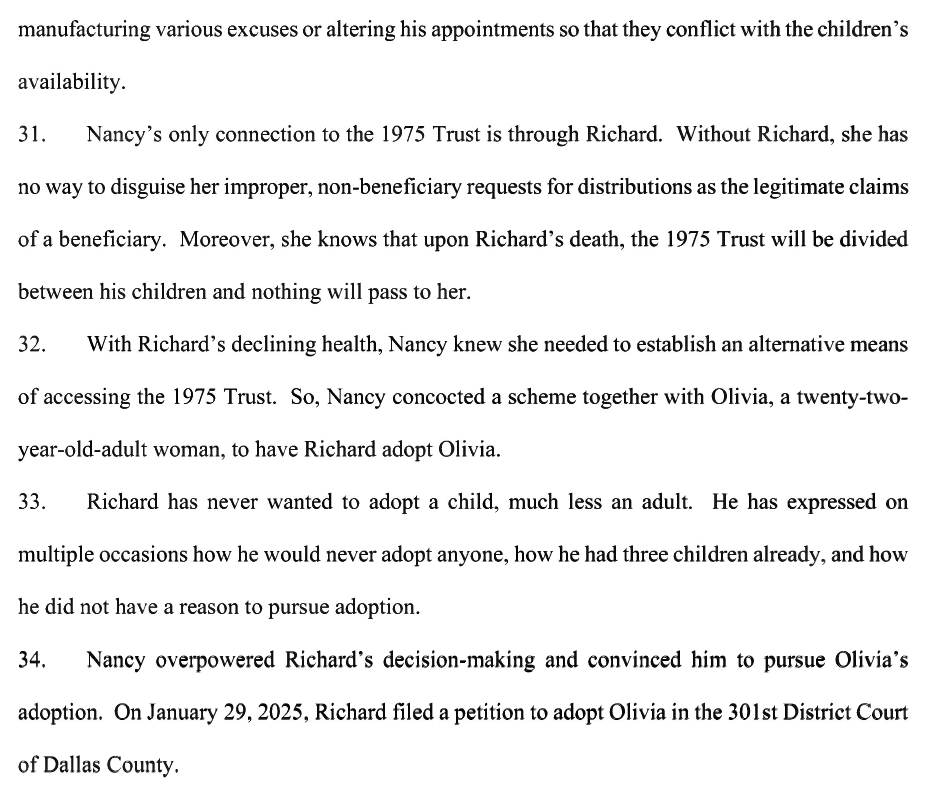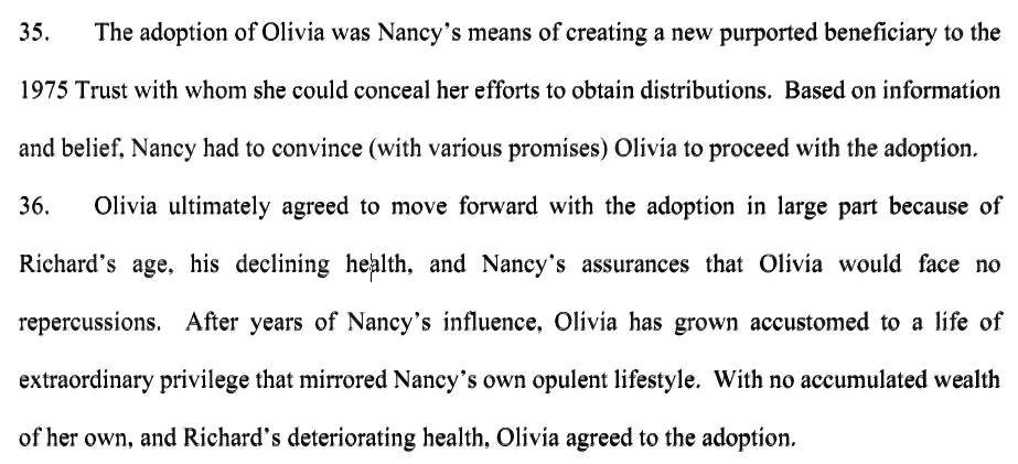So why would Richard and Nancy “adopt” her? Terri says Nancy came up with this scheme so that a share of Richard’s interest in the trust would go to Olivia. Nancy cannot inherit Richard’s share of the trust. It can only go to his children. It appears that this new “child” of Richard is being used to funnel wealth toward Nancy.