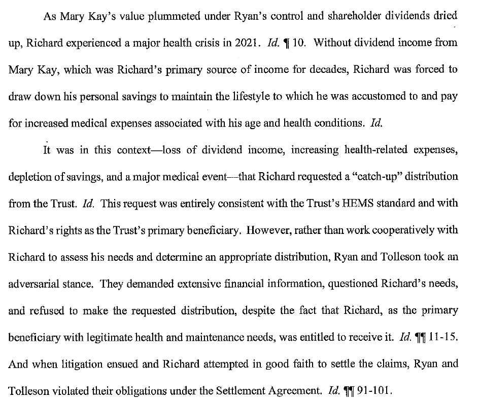 Remember: Richard started Mary Kay Cosmetics with his mom. The money in the trust all originated from MK. In other words, this is his money!!! Yes, he has set his heirs up financially, and has always said he wants them to have wealth for generations. But it all started with him and his mom, and it’s interesting to see the heirs fighting to stop Richard from accessing the money.