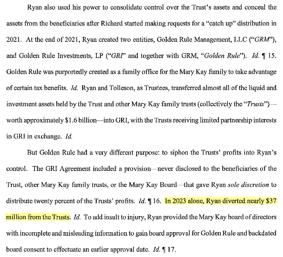 - Ryan created the two Golden Rule entities to “siphon” profits from the trust and other Mary Kay family trusts into Ryan’s control