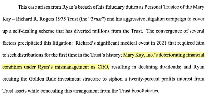 In one of Richard’s filings in the lawsuit, he cites mismanagement of Mary Kay by his son, Ryan: