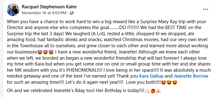 Racquel’s and Isabelle’s sales director is Kara Gallup! Racquel recently thanked Kara for a trip she earned.