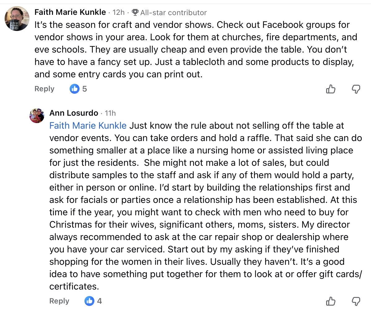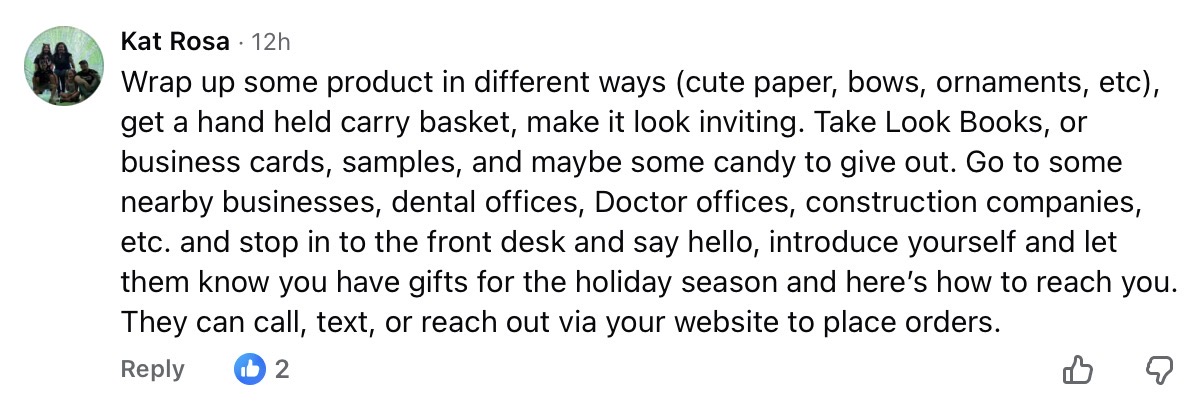 Faith Marie Kunkle has the helpful tip to set up a table at a craft show. They are cheap. You just need a tablecloth and product. Ann Losurdo then reminds everyone that you can NOT sell at vendor events. She thinks Isabella should focus on nursing homes. She can give out samples and the staff can provide leads for parties. Let men you know that you can help with holiday gifts. You can also offer gift certificates.
