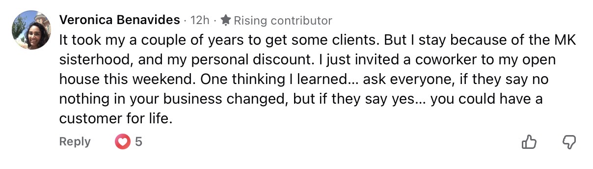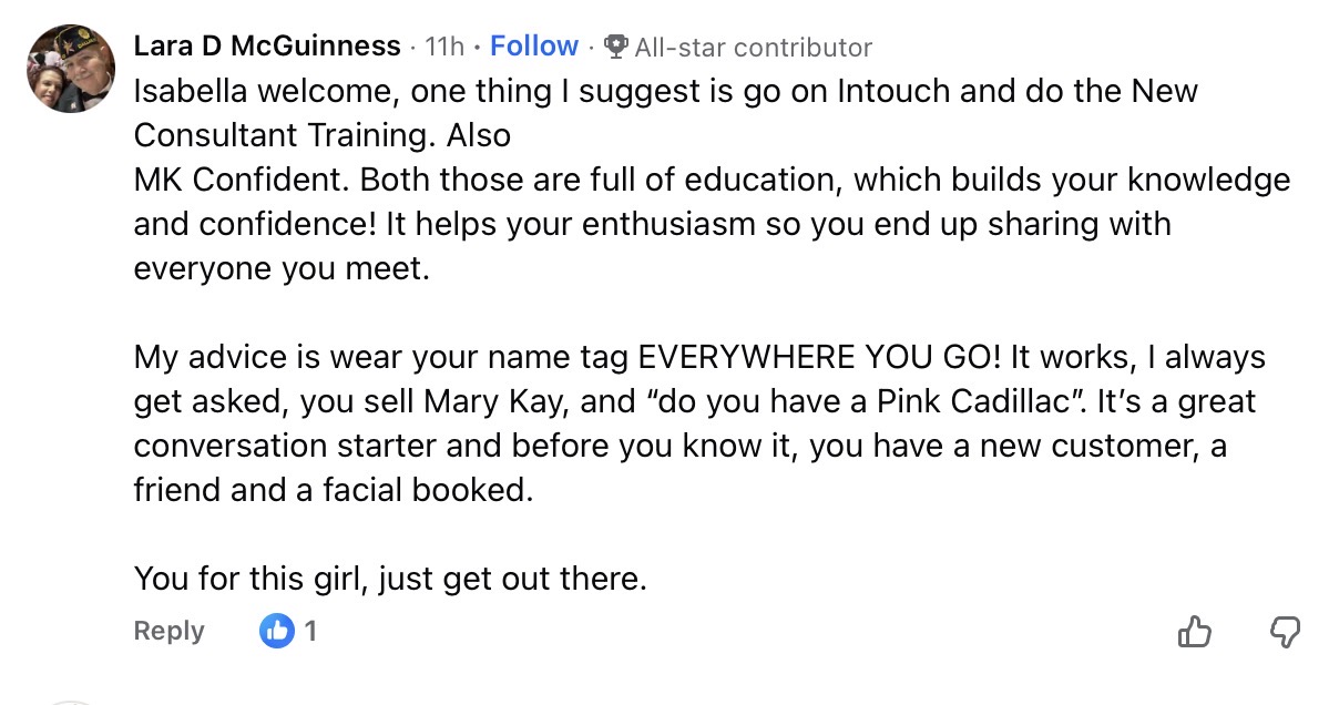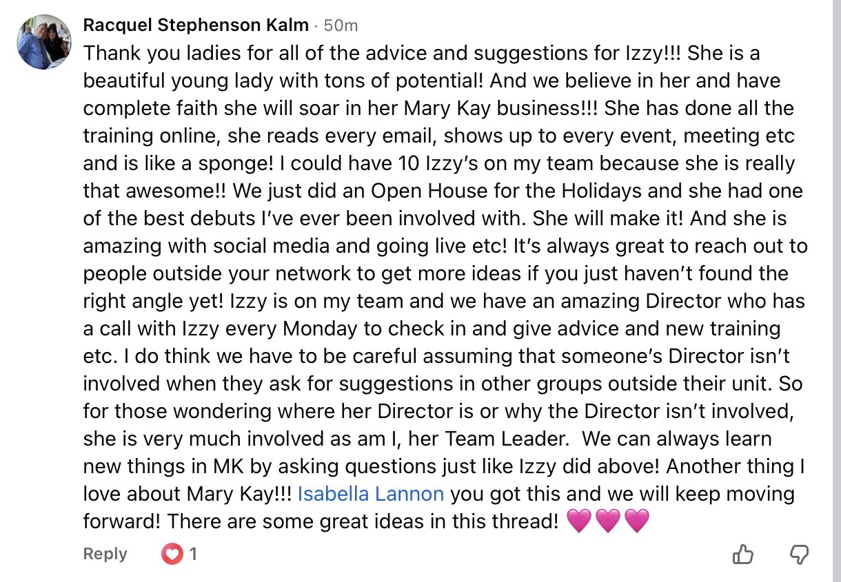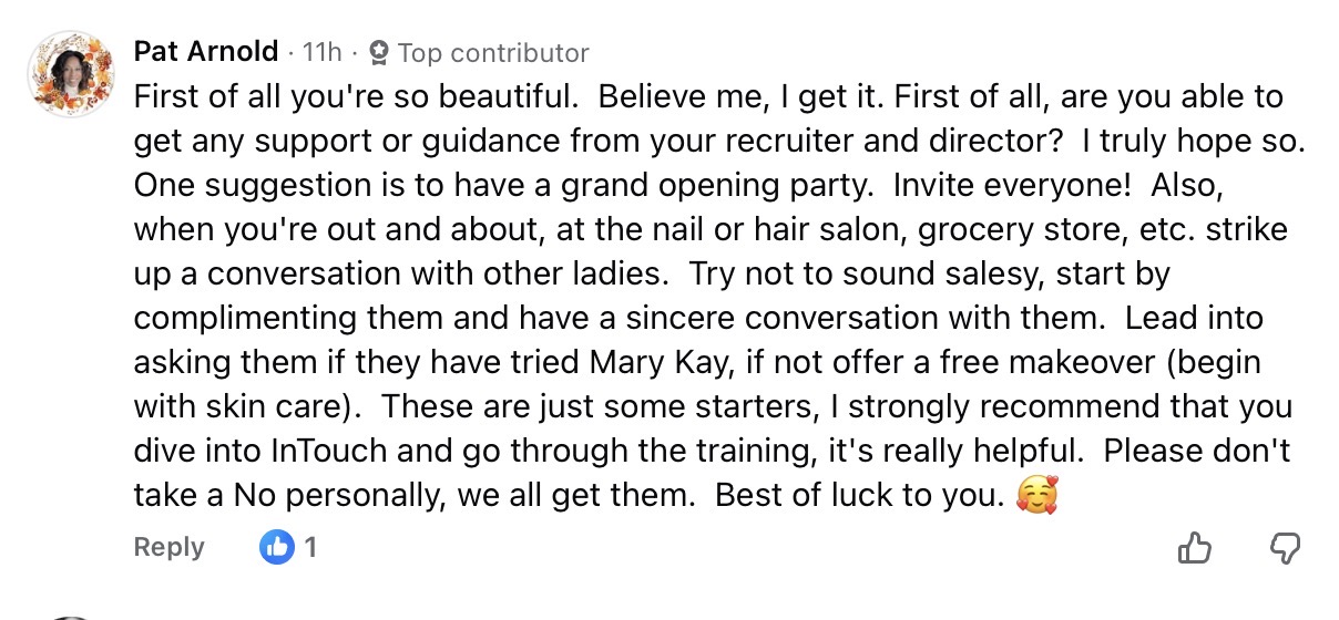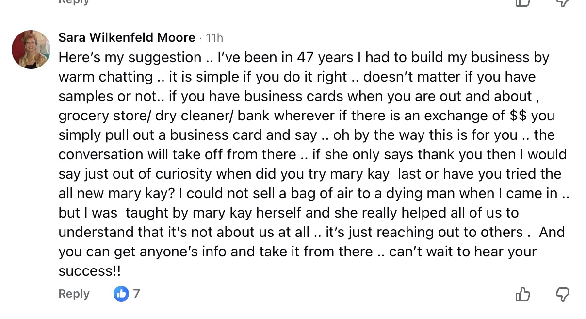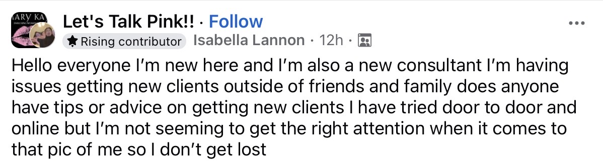 Isabella is a new consultant and asked for help with her business in the Facebook group Let’s Talk Pink. Like everyone who signs up as a Mary Kay consultant, the problem is finding customers. They tell you it will be easy, but once you’ve gone through your family and friends, good luck finding others.